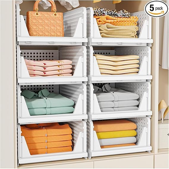 Upgrade your home organization with these stackable foldable closet storage baskets 5 pack white, designed to keep your clothes and essentials neatly arranged. Their smart modular design makes them a perfect multi layer wardrobe organizer drawer basket system, allowing flexible stacking for different storage needs. Ideal for every room, these space saving plastic storage bins for closet organization help you maximize space while maintaining a clean and modern look.