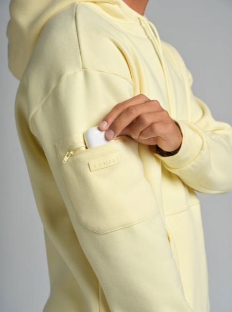 Wrap yourself in Comfrt and unplug with Airplane Mode. Made from our ultra-soft Combed Cotton Blend™, this hoodie is built for long flights and even longer naps. A built-in contoured eyemask lets you snooze in peace, while zip sleeve pockets keep your AirPods close. Hidden compartments inside the kangaroo pocket store your passport, ID, and cash securely. Finished with an oversized, double-lined hood for total comfort—no matter where you land.
