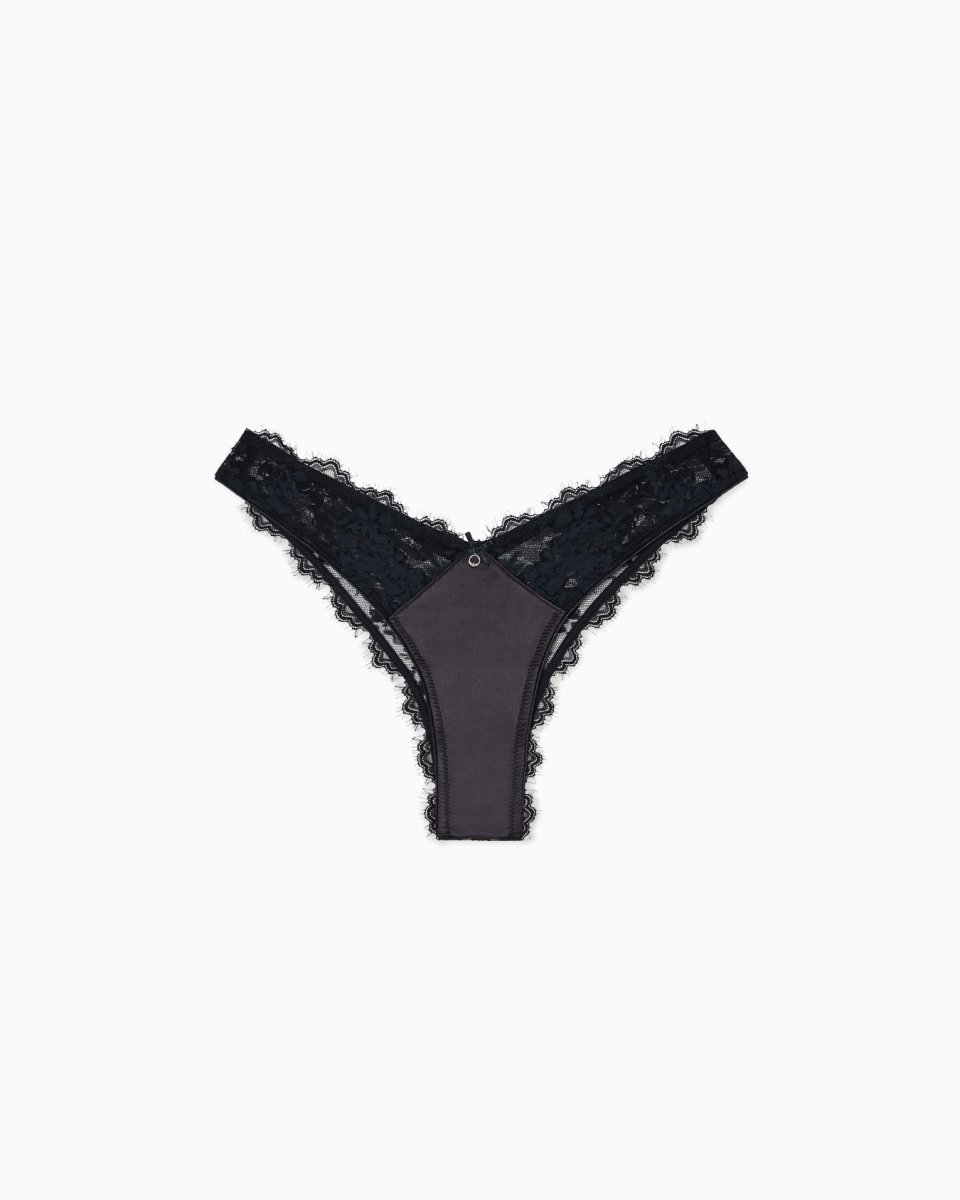Brazilian briefs made of lace with satin detail and logo charm. A refined blend of elegance and sensuality for an allure day to night.