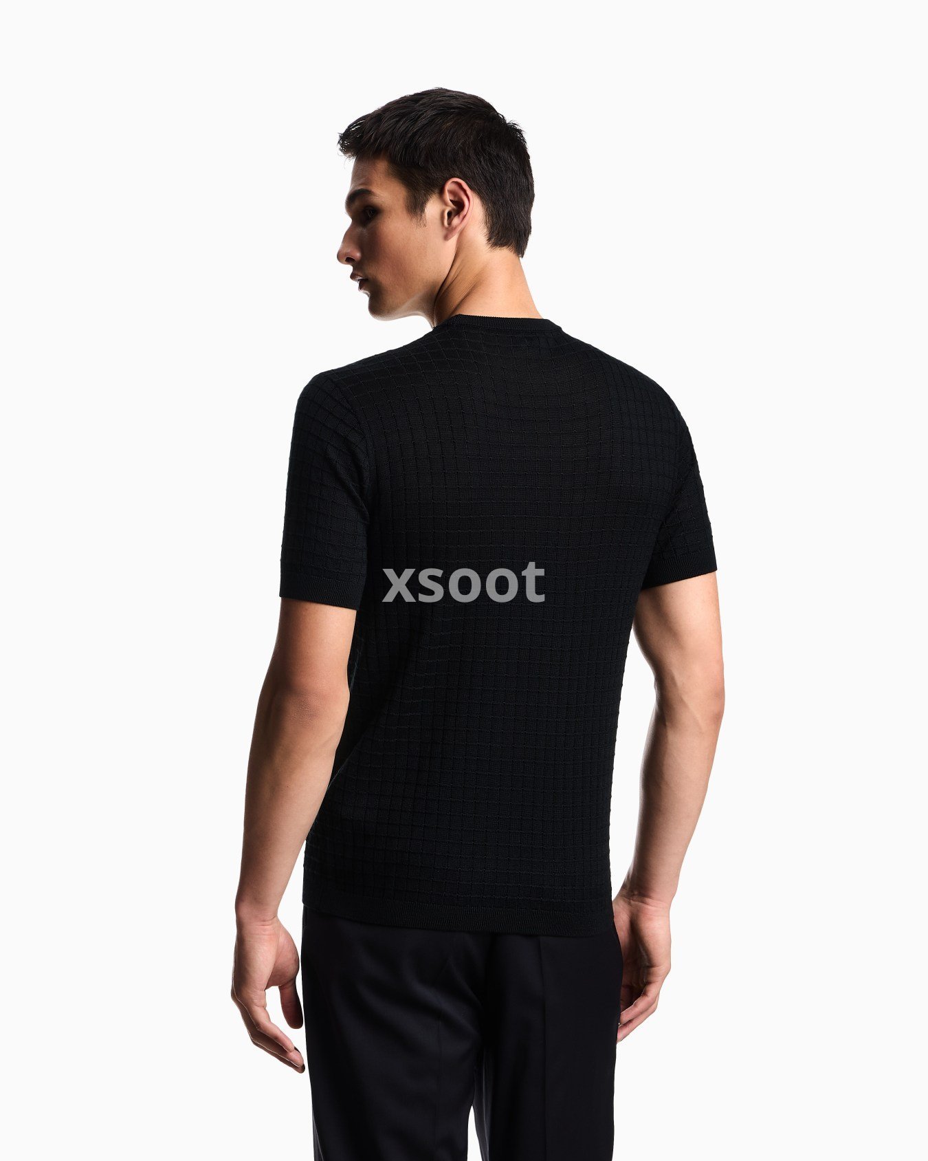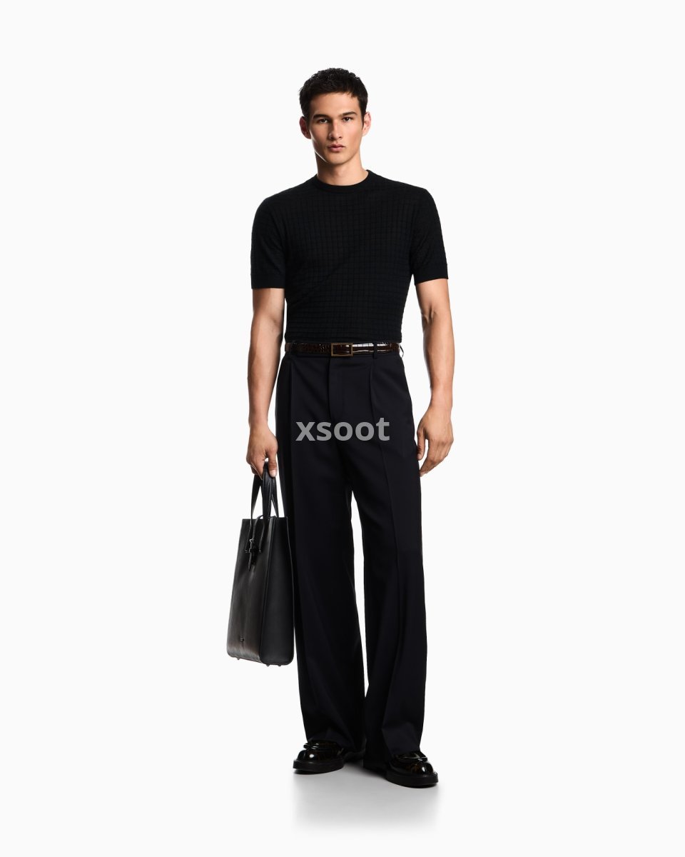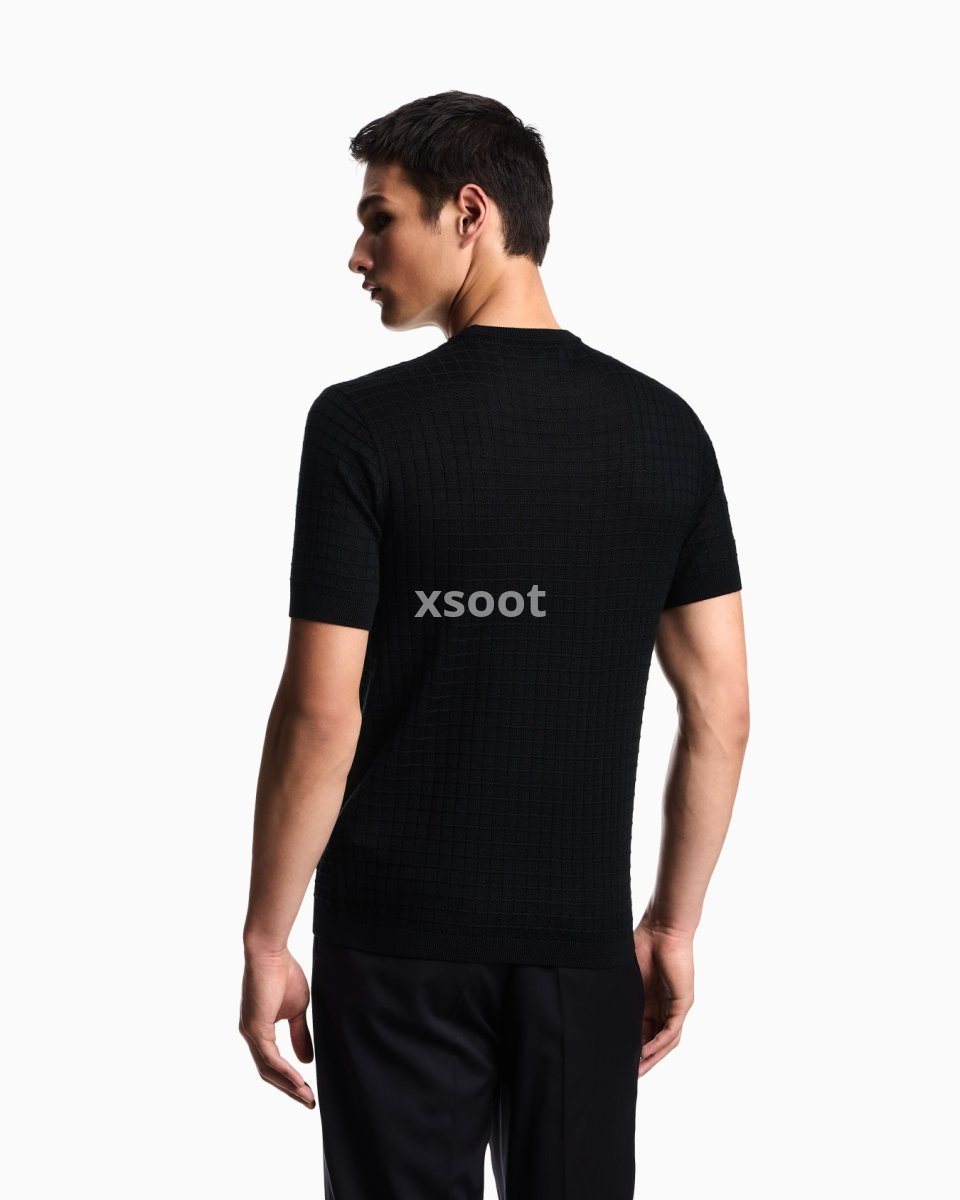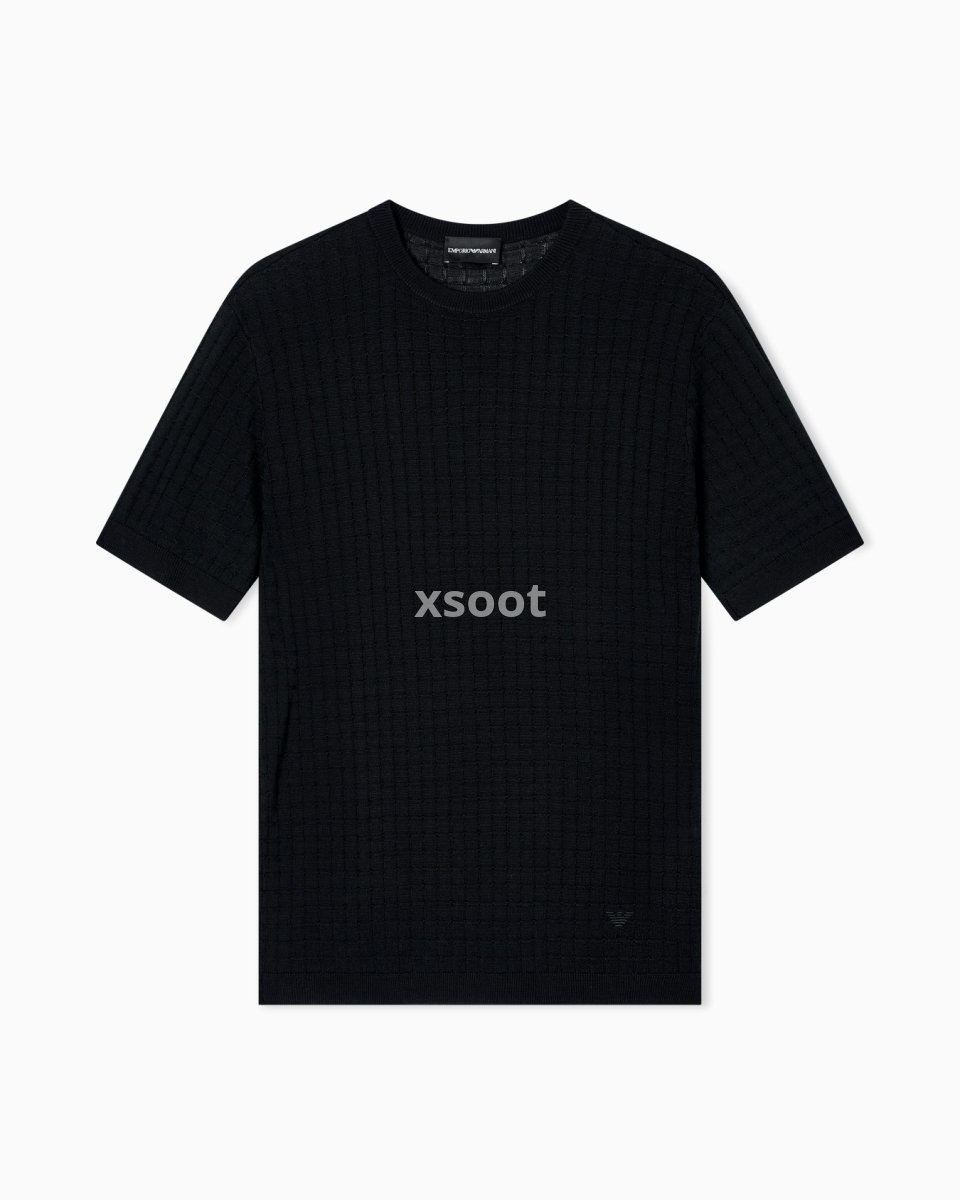 Short-sleeved, crew-neck jumper in a plain and purl knit, creating a check-like op-art texture. Made in a wool and Lyocell blend. Lyocell is a semi-synthetic fibre that has an exceptionally low impact on the environment. It is derived from eucalyptus trees and is renowned for being very durable, breathable, absorbent and wrinkle-proof.