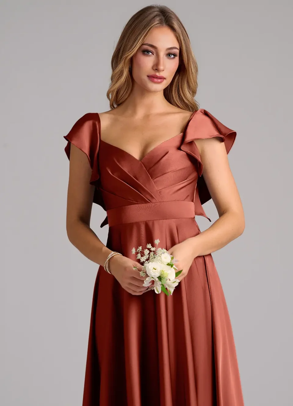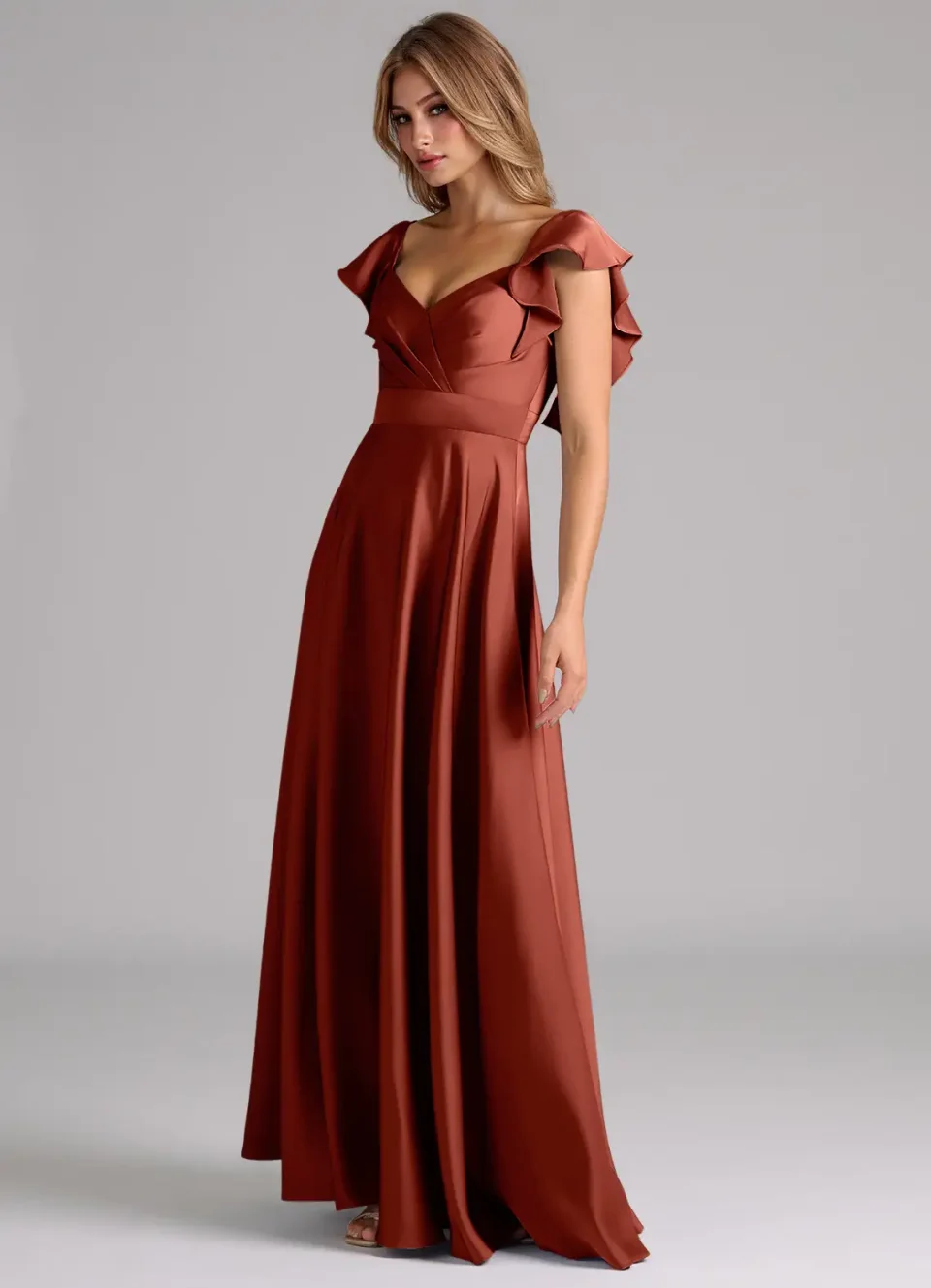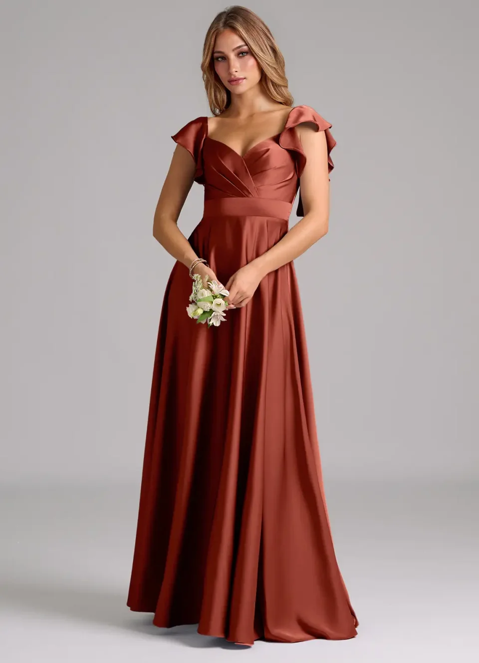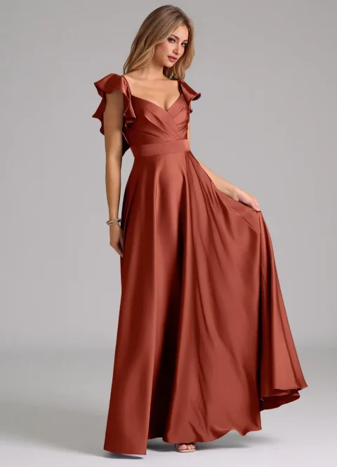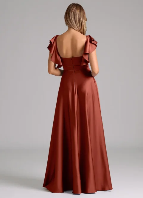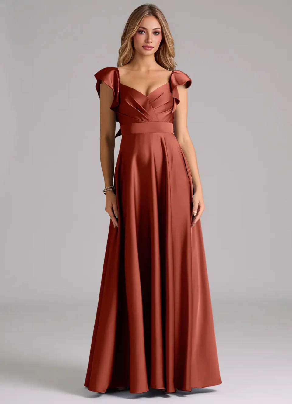 Make a bold yet elegant impression with this terracotta satin a line dress ruched, designed to enhance your natural shape with a flattering silhouette. The soft shine of satin paired with a tailored fit gives it a refined touch, while the comfort of a stretch satin evening dress fitted waist ensures easy wear. Its rich earthy tone and structured design make it a standout rust color formal dress elegant look for special occasions.