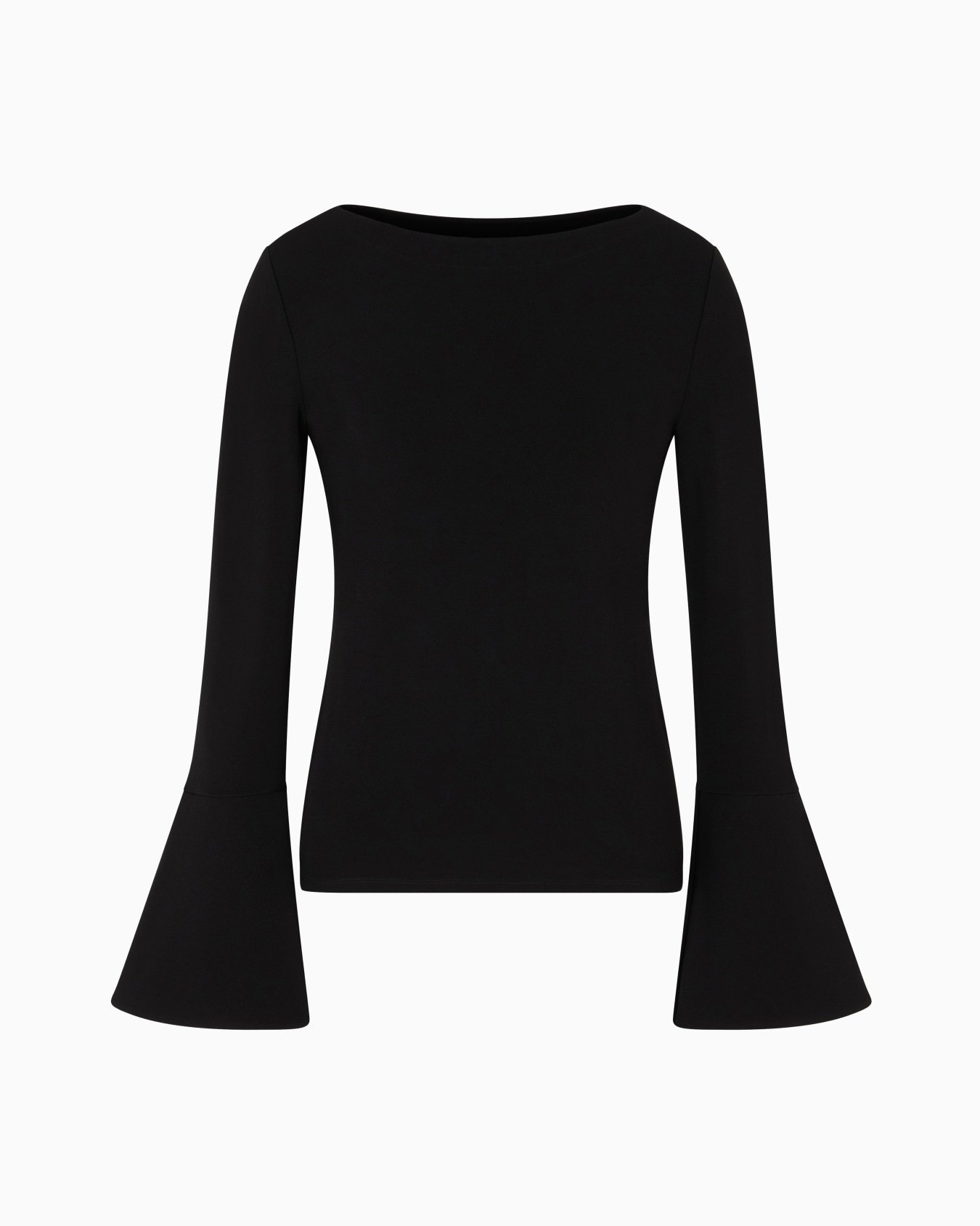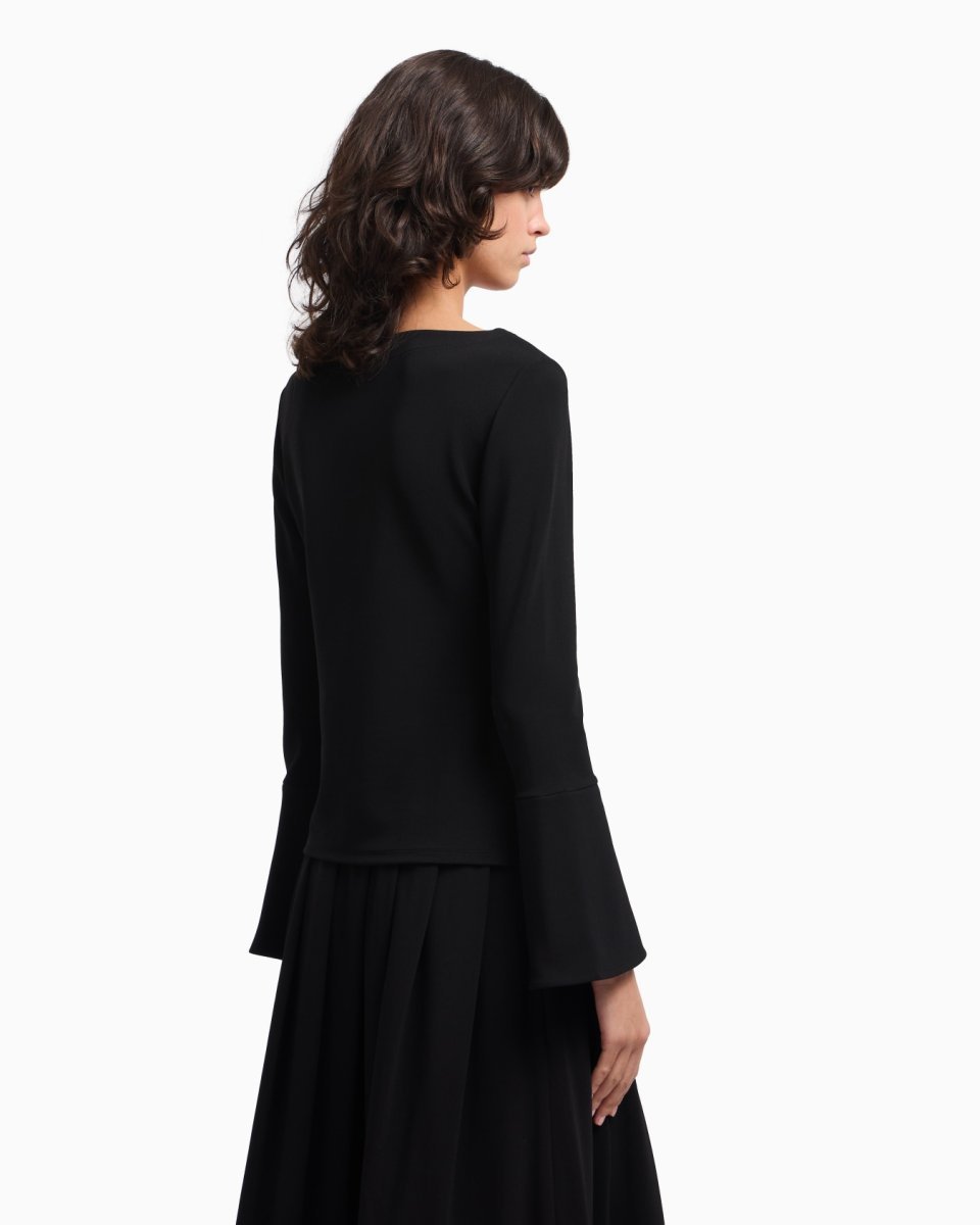 Boat neckline top with long sleeves flared and padded at the cuffs, made of crêpe viscose jersey. The fluid lines and feminine cut make this piece perfect on every occasion, from mornings at the office to after-work drinks.