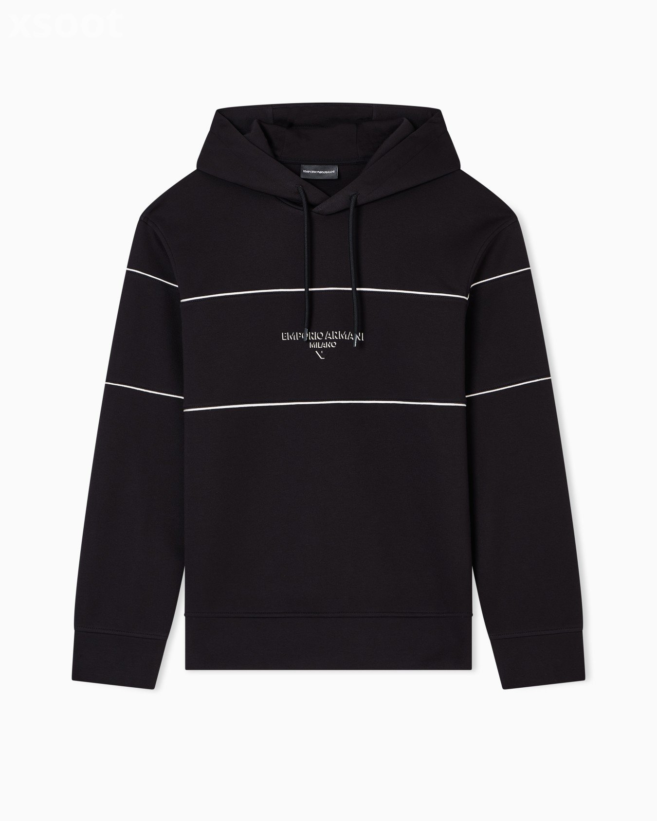 weatshirt with drawstring hood and decorative piping made of cosy 100% modal double jersey. The Emporio Armani Milano logo accompanied by the iconic eagle is offered with an original three-dimensional effect created by the contrasting white print creates a chiaroscuro shaded effect that enhances the 3D look.