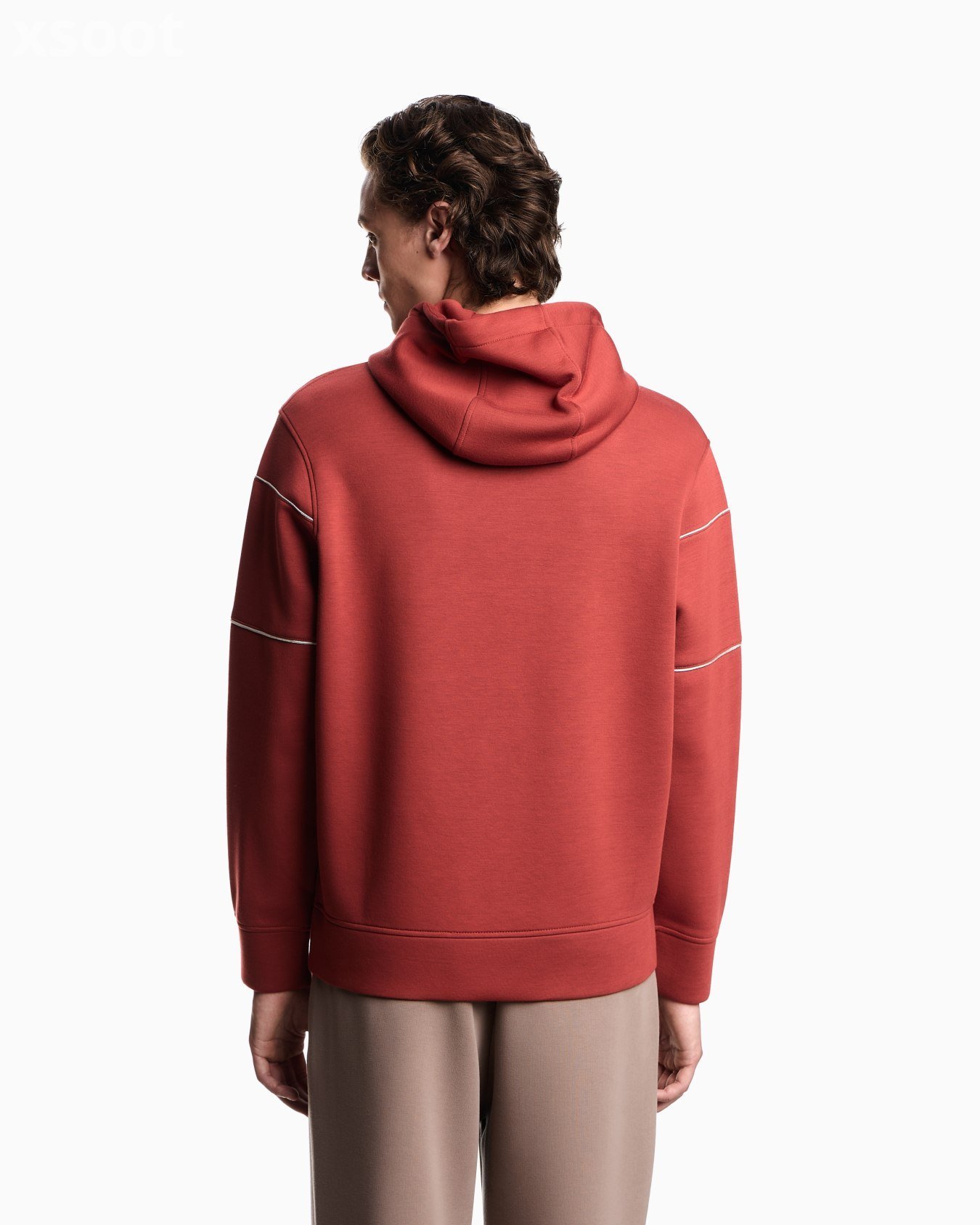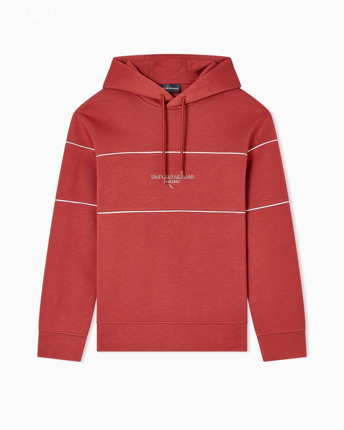 Sweatshirt with drawstring hood and decorative piping made of cosy 100% modal double jersey. The Emporio Armani Milano logo accompanied by the iconic eagle is offered with an original three-dimensional effect created by the contrasting white print creates a chiaroscuro shaded effect that enhances the 3D look.