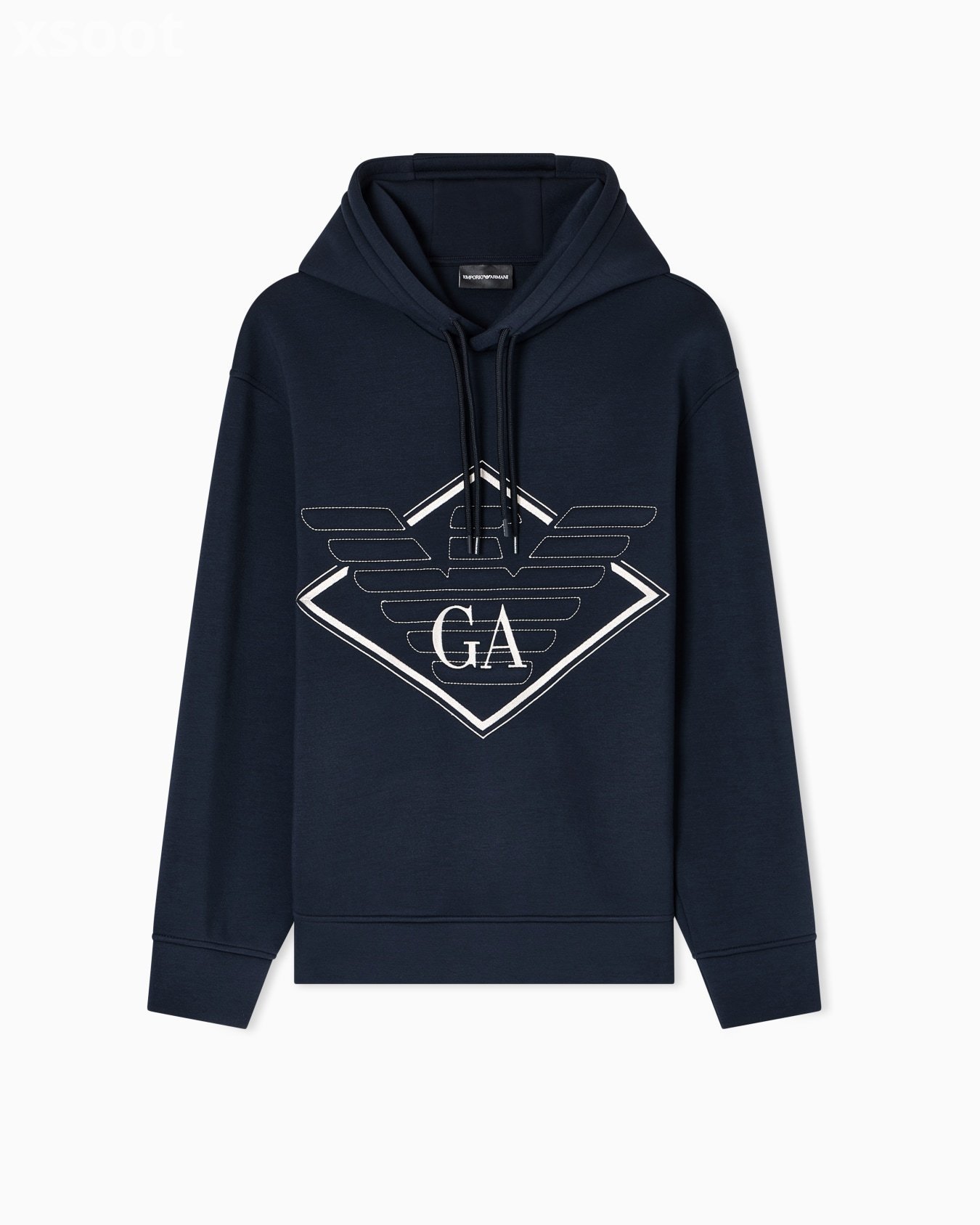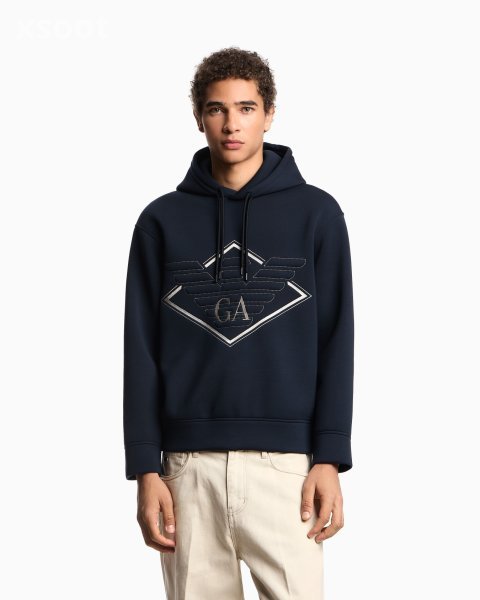 Cosy 100% modal double jersey sweatshirt with hood with double drawstring. The oversized embroidery on the front with the iconic eagle in a domed and super-embossed effect is characterised by a topstitched profile.