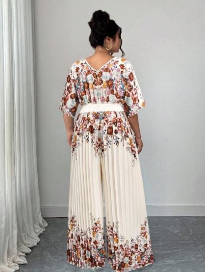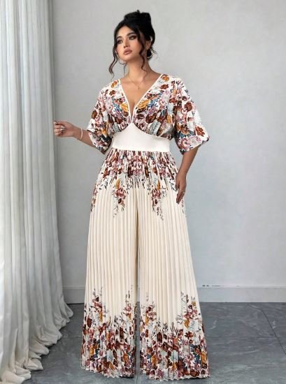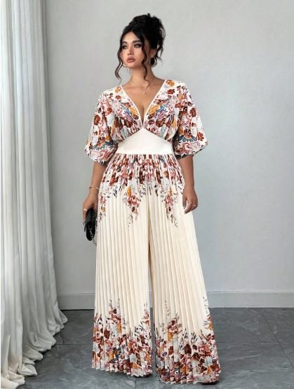 Step into effortless elegance with the Elenzga Women’s Printed Deep V-Neck Batwing Sleeve Pleated Jumpsuit, a perfect blend of sophistication and modern style. Designed for women who love chic yet comfortable outfits, this jumpsuit features a flattering deep V-neckline that enhances your look with a touch of bold femininity.The batwing sleeves add a graceful, flowy silhouette, while the pleated design brings texture and elegance to the overall outfit. The eye-catching print makes it stand out, making it ideal for both business casual settings and stylish summer outings.