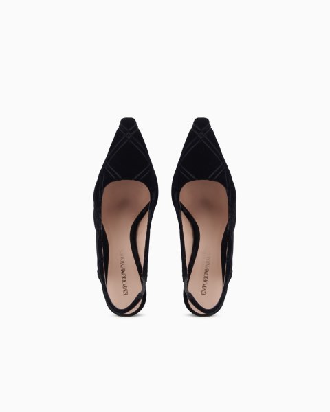 Pointed slingback court shoes with velvet uppers embellished with a high-frequency quilted motif. A new offering of heeled footwear with a distinctive slinky shape, designed to accompany outfits from the morning to evening drinks.