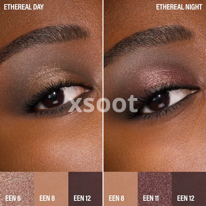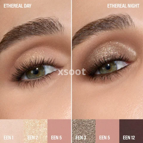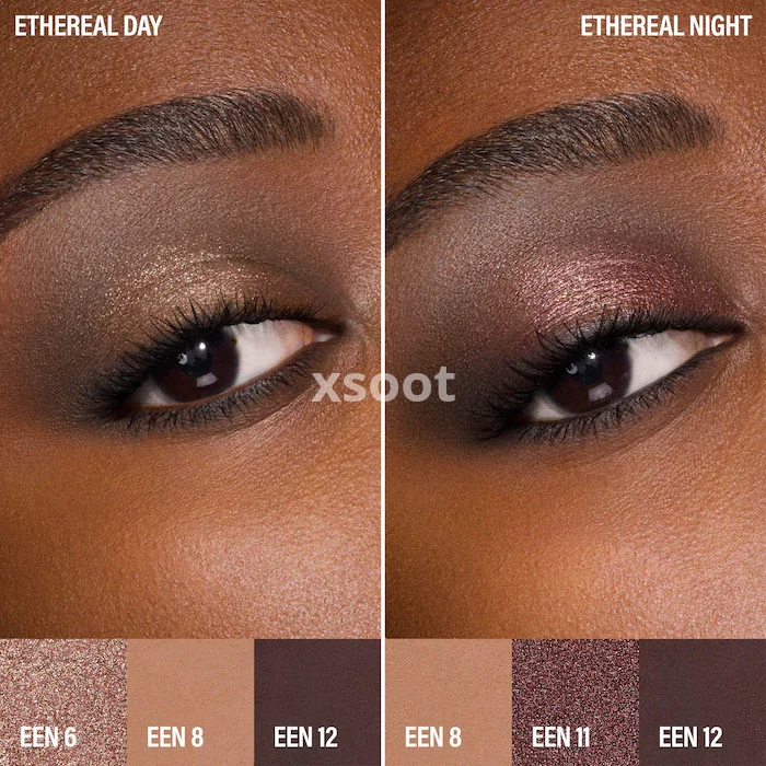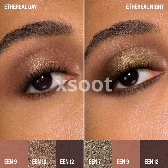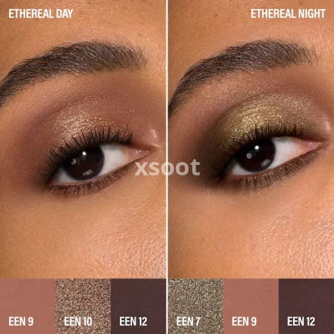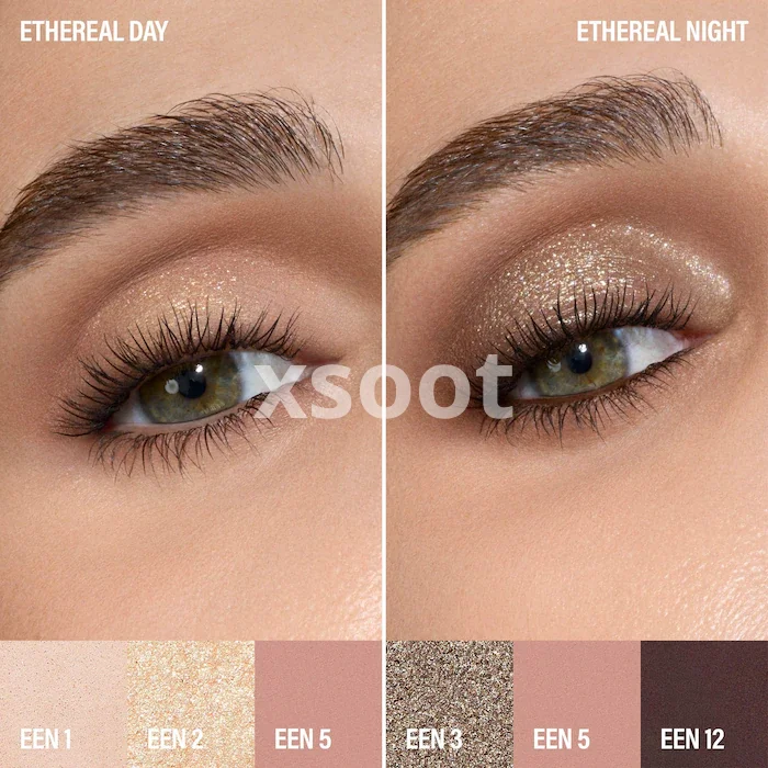- 12 x 0.05 oz/ 1.3 g Eyeshadows in EEN 2 (shimmering peach champagne), EEN 1 (satin cream), EEN 3 (shimmering taupe), EEN 4 (matte warm beige), EEN 5 (matte dusty rose), EEN 6 (shimmering rose gold), EEN 7 (shimmering golden olive), EEN 8 (matte camel brown), EEN 9 (matte neutral medium brown), EEN 10 (shimmering golden bronze), EEN 11 (metallic bronze burgundy), EEN 12 (matte mahogany brown)