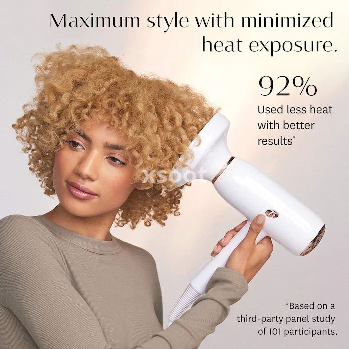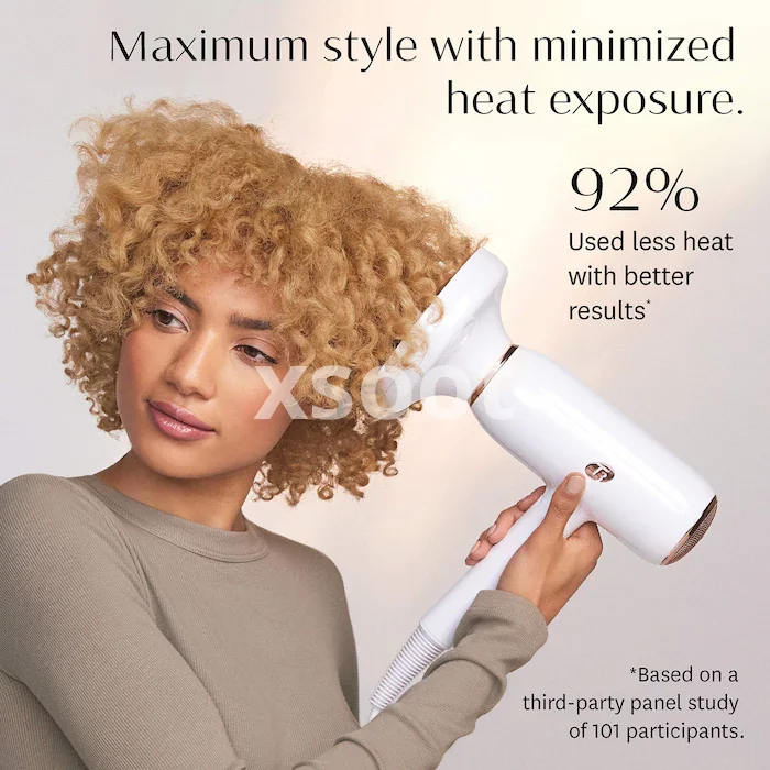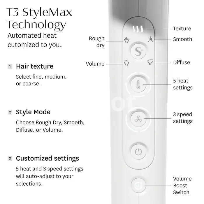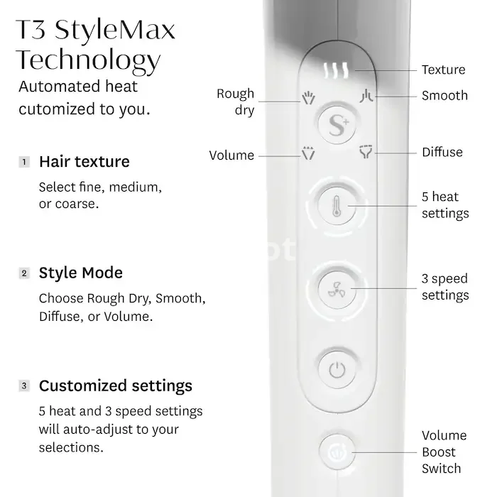 What Else You Need to Know: With T3 StyleMax™ Technology, this hair-dryer auto-adjusts between five heat settings and three speed settings to adapt to your unique hair and styling goals, delivering smooth, shiny results with less damage. Digital T3 IonAir™ Technology powers a wide, ion-infused airstream to gently dry hair fast while locking in body and shine. The smart microchip digitally controls the heat settings to keep temperature fluctuations in check, while the custom-designed fan propels a 2X wider airflow for faster drying. Additionally, the ion generator minimizes static frizz, boosts shine, and locks in your style, leaving you with a salon-worthy finish every time.