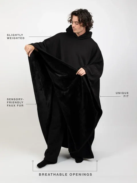 The hoodie features breathable openings and sensory-friendly faux-fur lining, creating a soothing, cozy environment ideal for unwinding after a long day or staying comfortable during travel.