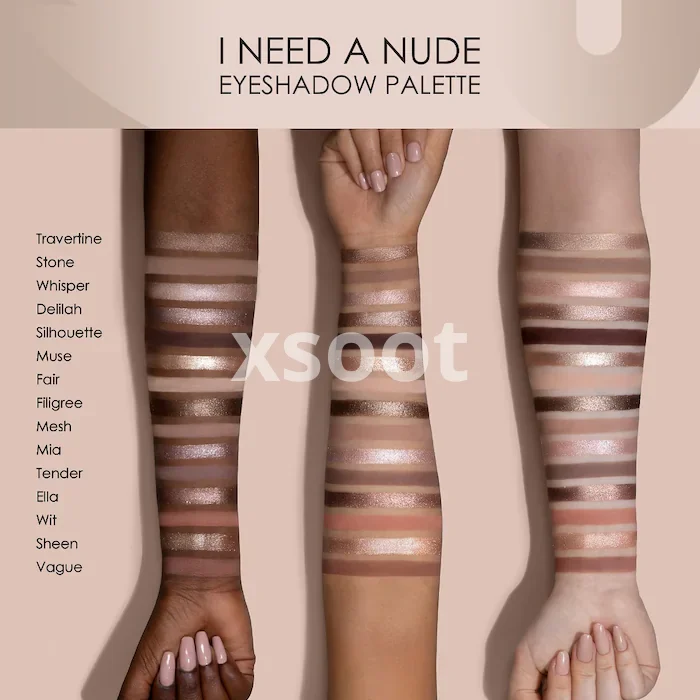 - 15 x 0.04 oz/ 1.28 g Eyeshadows in Stone 493CM (matte light medium warm taupe), Whisper 494M (metallic light nude pink), Ella 495SF (sparkling foiled warm fawn), Vague 496CM (matte medium warm dusty), Rose Travertine 497M (metallic soft amber), Delilah 498SW (sparkling wet effect silver brown), Silhouette 499CM (matte coffee bean brown), Muse 500SF (sparkling foiled champagne), Fair 501CM (matte light misty rose), Filigree 502SF (sparkling foiled medium neutral brown), Wit 503CM (matte light warm rose), Sheen 504GW (glossy wet effect warm champagne), Tender 505CM (matte medium taupe), Mesh 506CM (matte light dusty rose), Mia 507SW (sparkling wet effect icy pink)