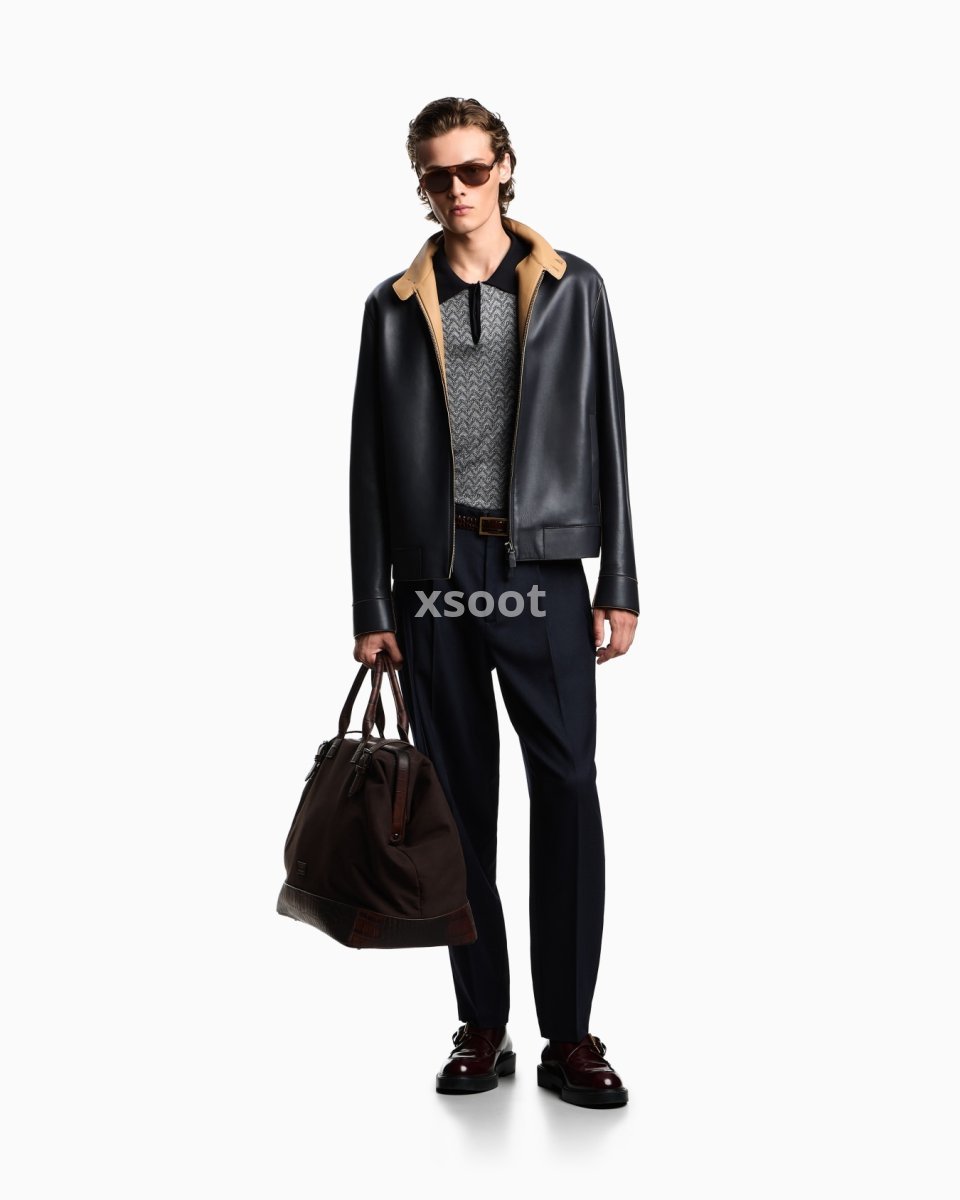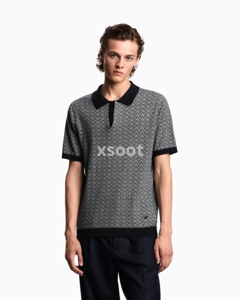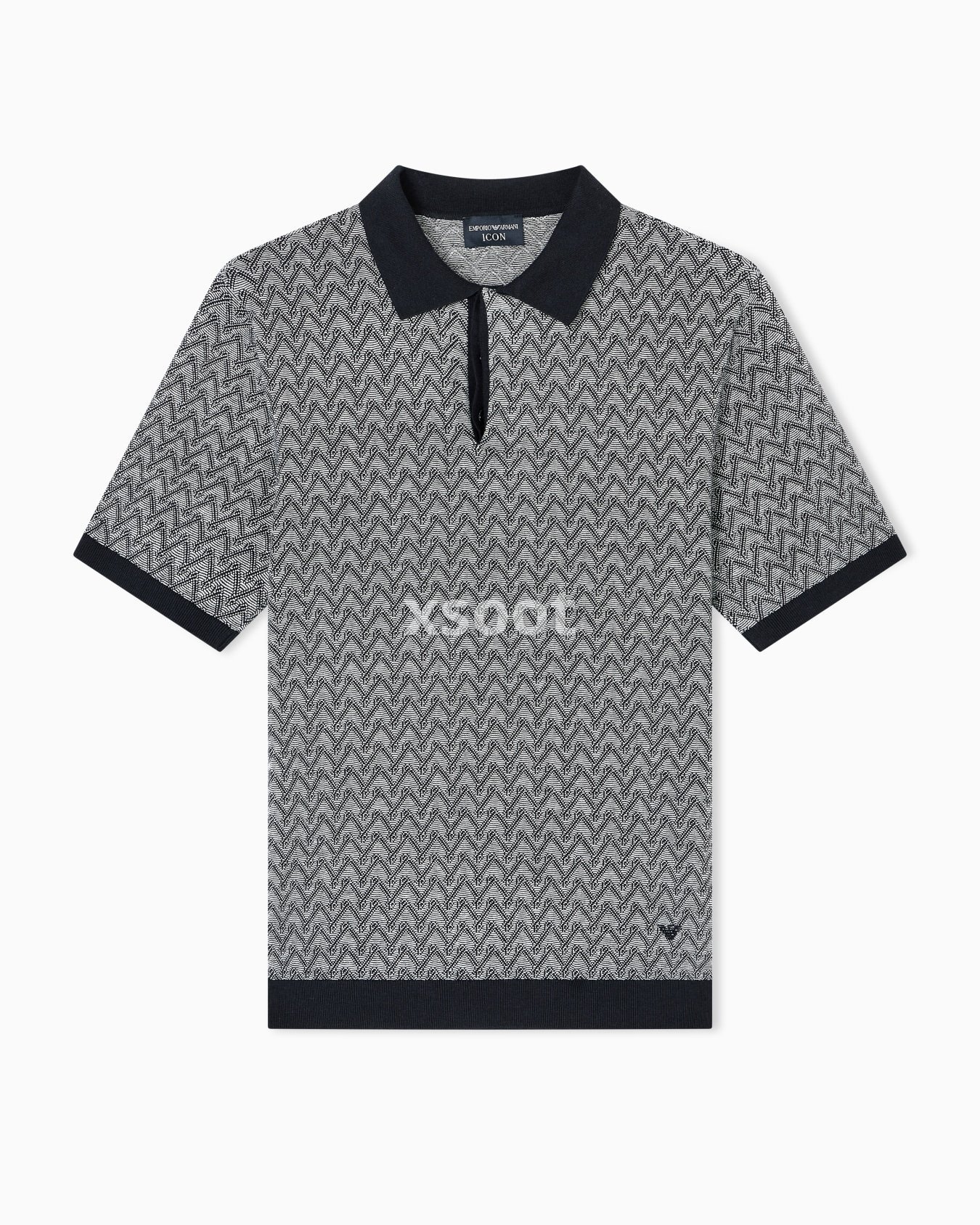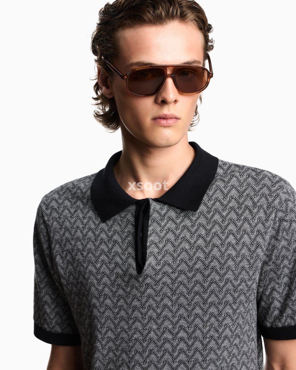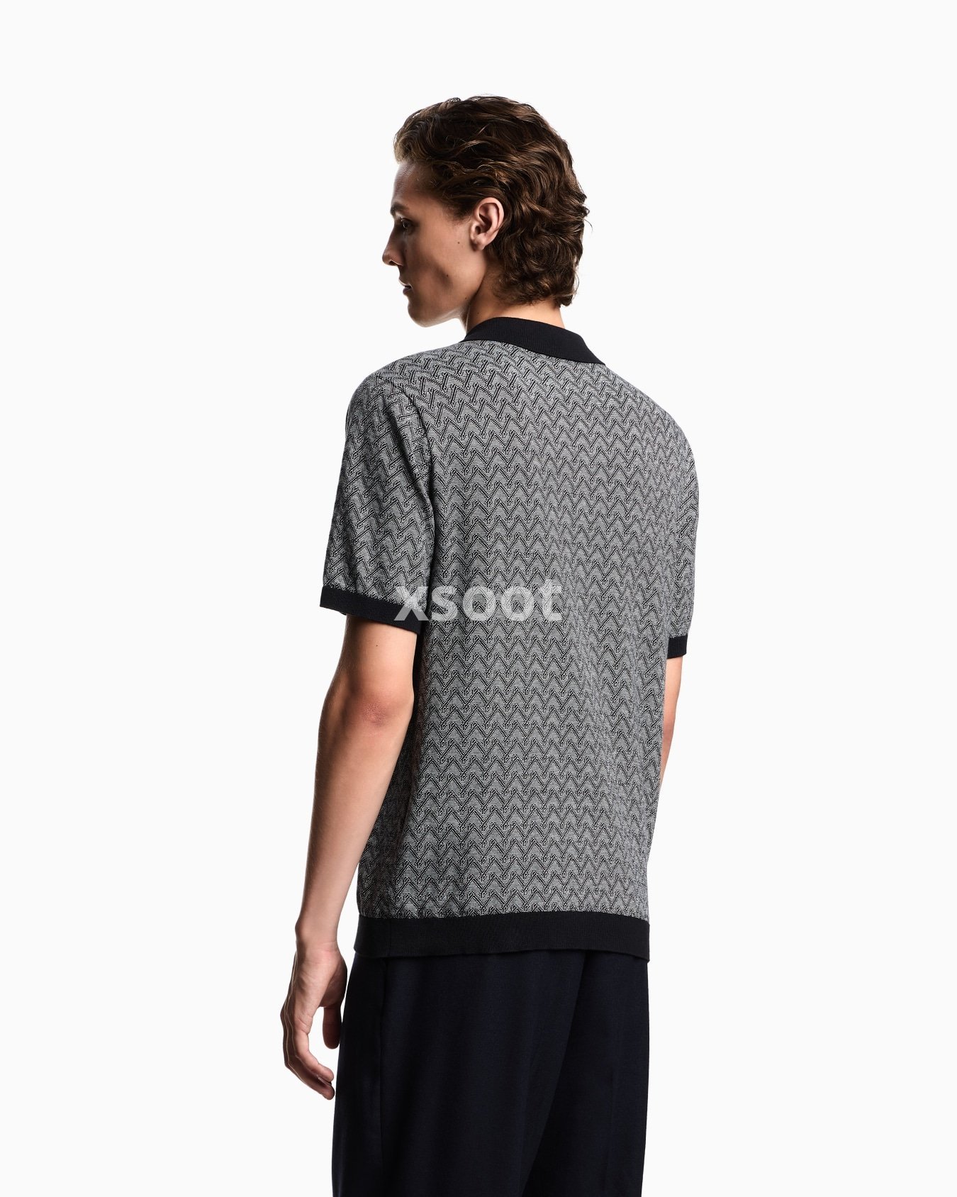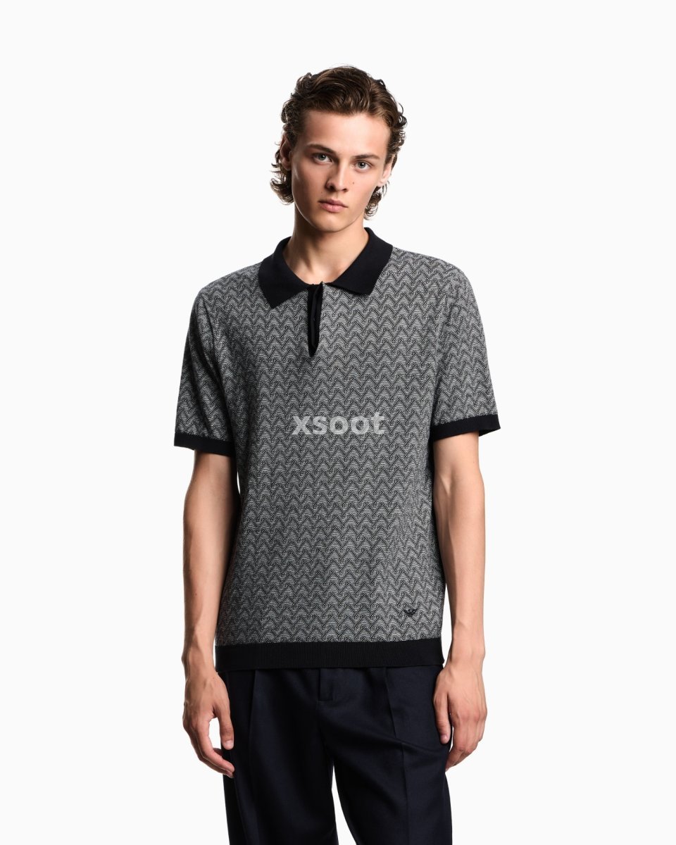 Jumper with polo-shirt collar and short sleeves, distinguished by a jacquard motif and signature chevron pattern across the entire style. The Icon capsule collection is dedicated to the Emporio Armani man and celebrates, season after season, the versatility and timeless elegance of the brand, reworking iconic clothing with a modern twist, in a perfect harmony of tradition and innovation. The FW25 selection is initially defined by fluid and airy silhouettes that play on blue and camel tones, then continues with a focus on exclusive knitwear distinguished by graphic designs and patterns with a strong visual impact.