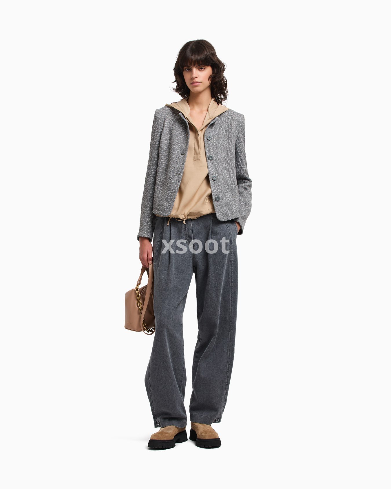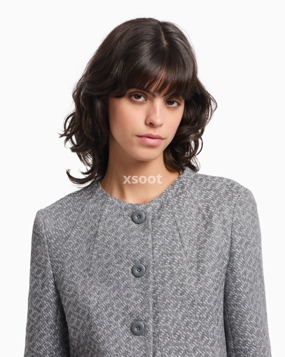 Single-breasted, crew-neck jacket made of a jacquard knit. The tricot-effect weave embellished with a distinctive micro-pattern is the distinctive feature of this style making it unique and sophisticated. The garment is part of the Icon capsule collection.