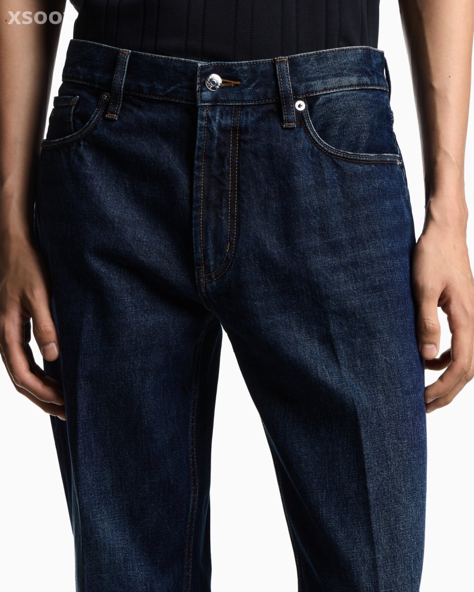 Five-pocket jeans featuring a regular waist, straight leg, comfortable rise and zip closure. The particularly rigid weave is treated with an enzyme stone wash that creates a distinctive worn look on the canvas, with characteristic refined front ribs.