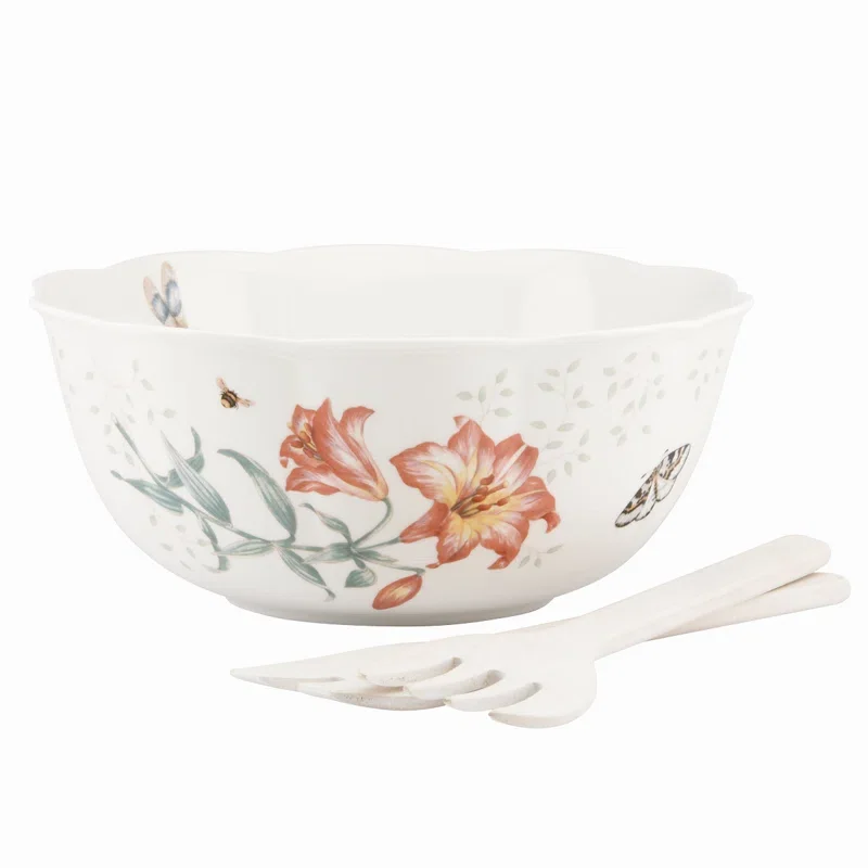 Based on the artistry of Louise Le Luyer, Butterfly Meadow Salad Bowl & Servers Set features monarchs, tiger swallowtails orange sulfurs, other winged species and even dragonflies.