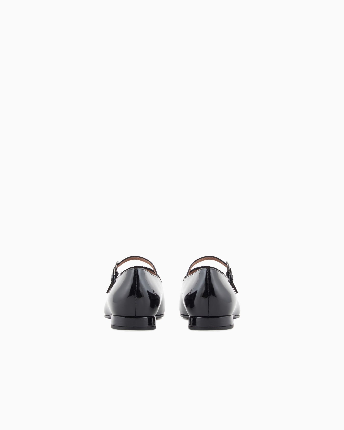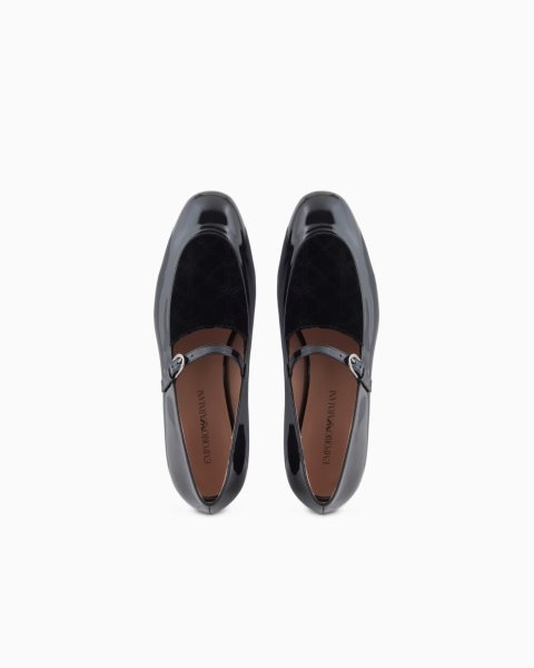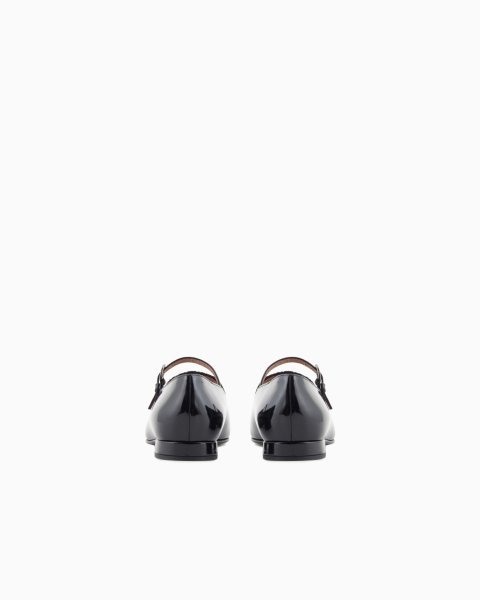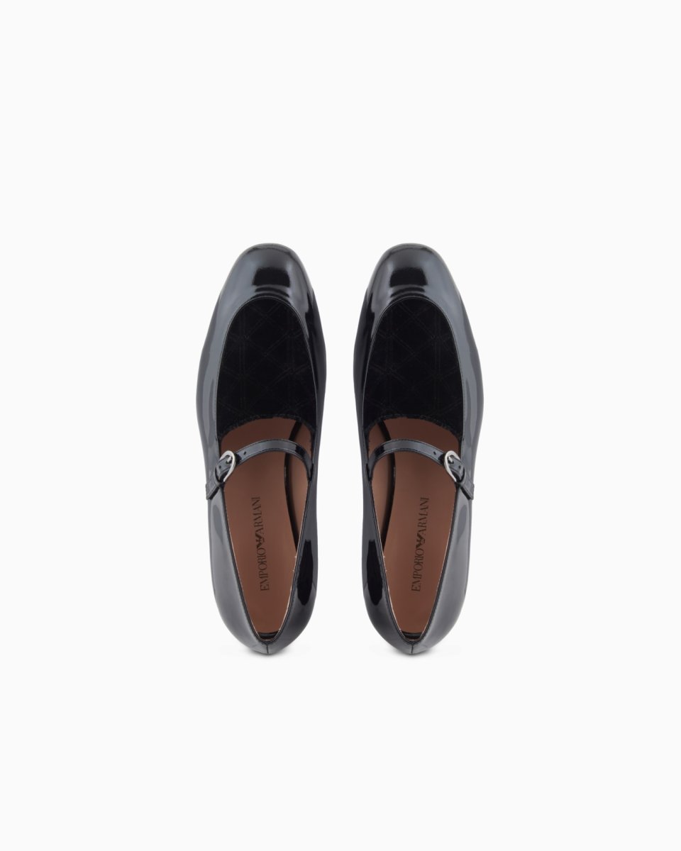 Patent leather Mary Jane ballerinas with a strap embellished with velvet inserts with a high-frequency quilted motif. A new footwear item designed to accompany outfits from the morning to evening drinks.