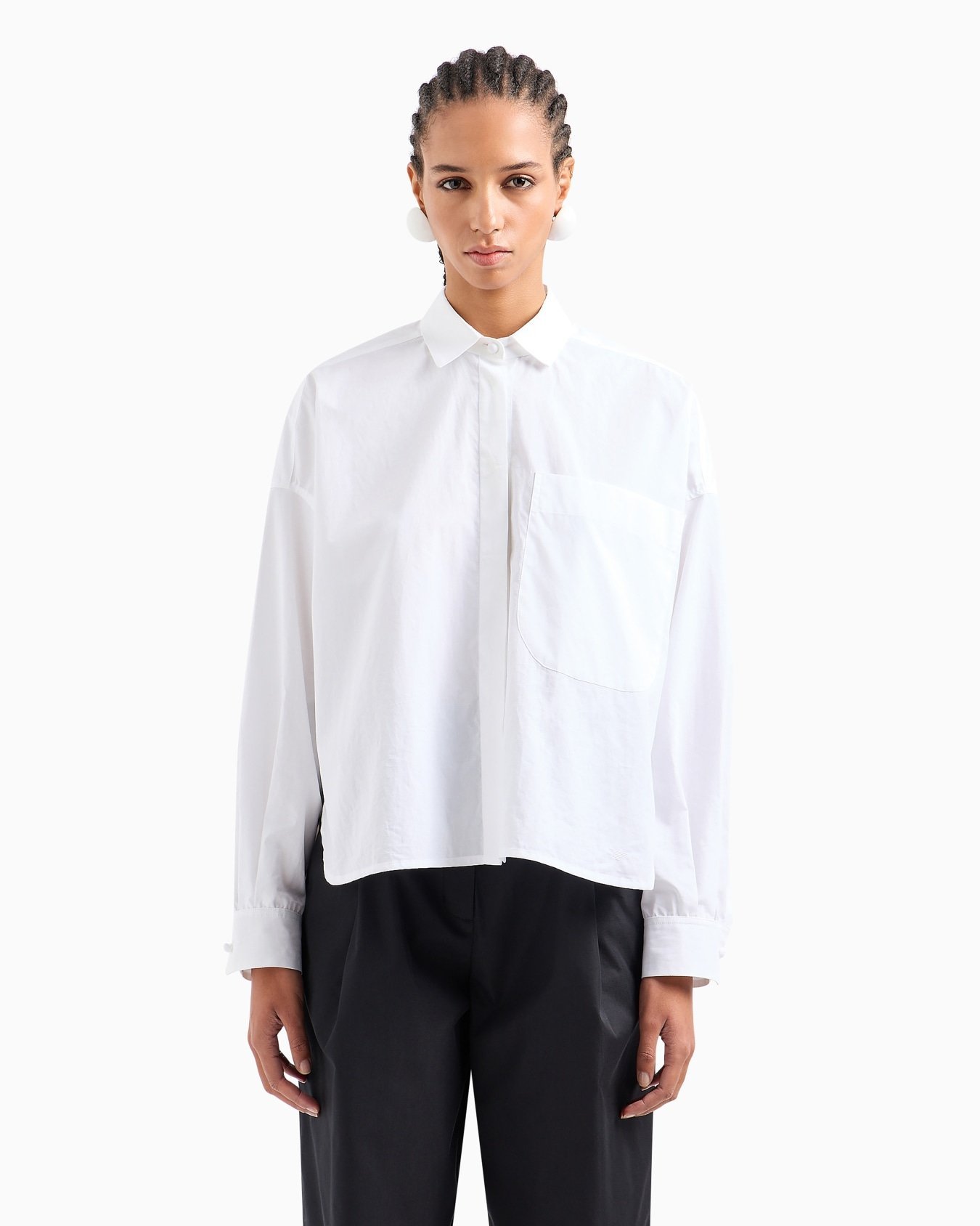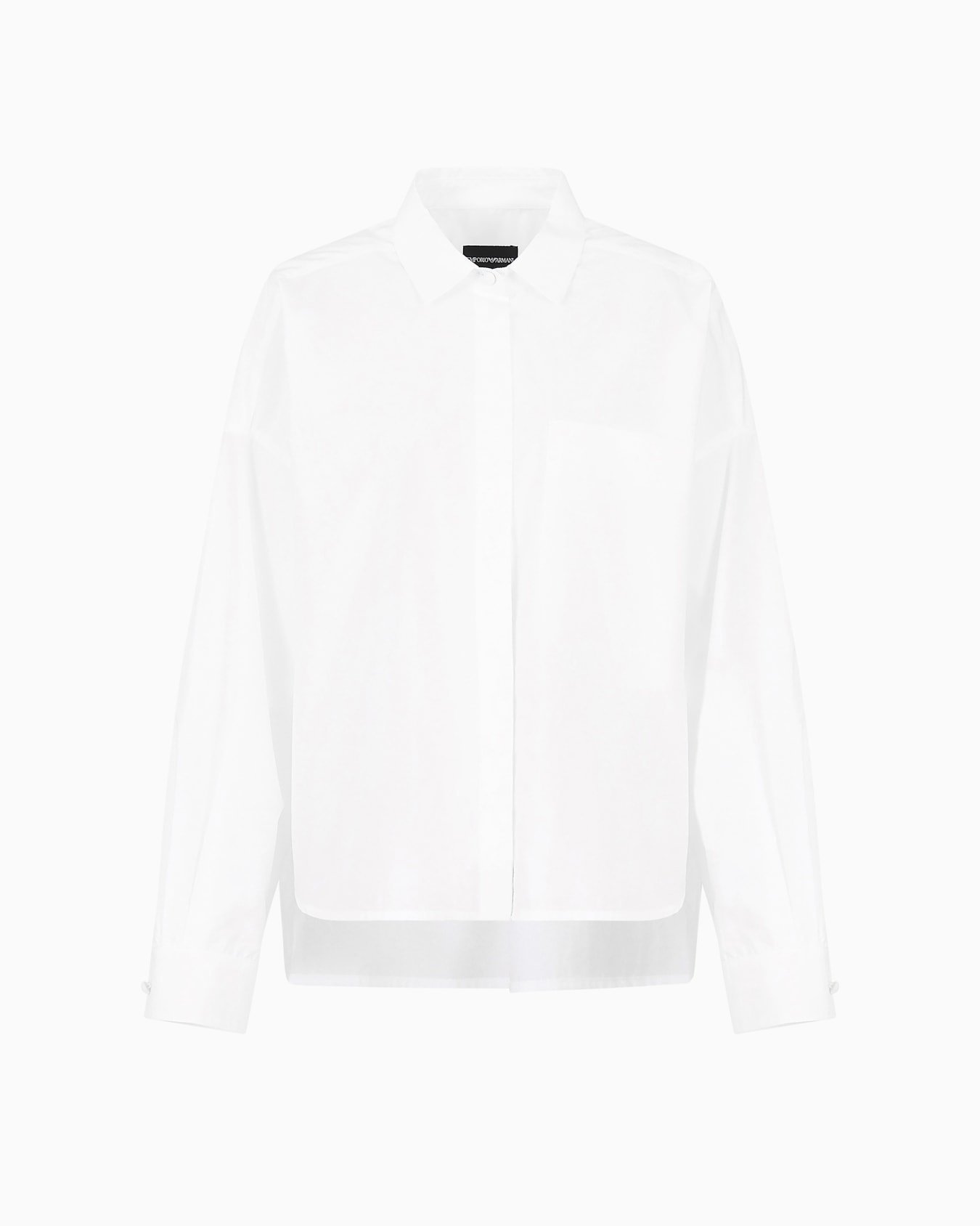Shirt with classic collar, patch pocket and asymmetric hem with side slits. Made from crisp pure cotton poplin, it adds a summery touch to every look, while the straight fit confirms its modern attitude.