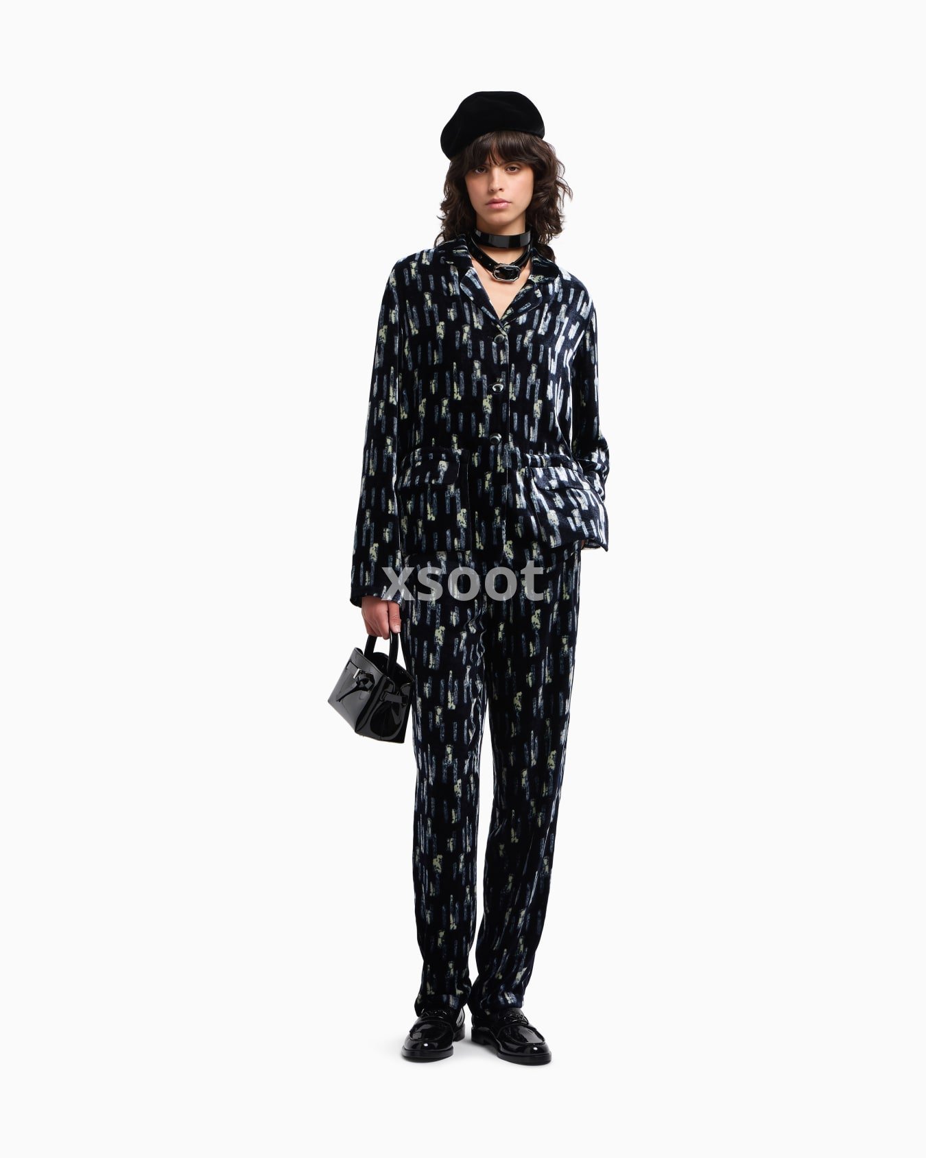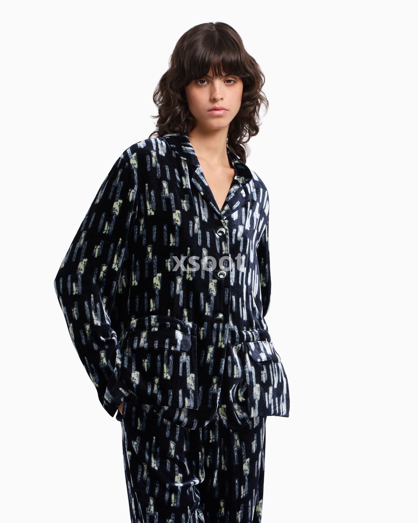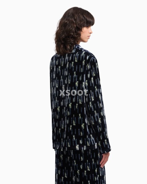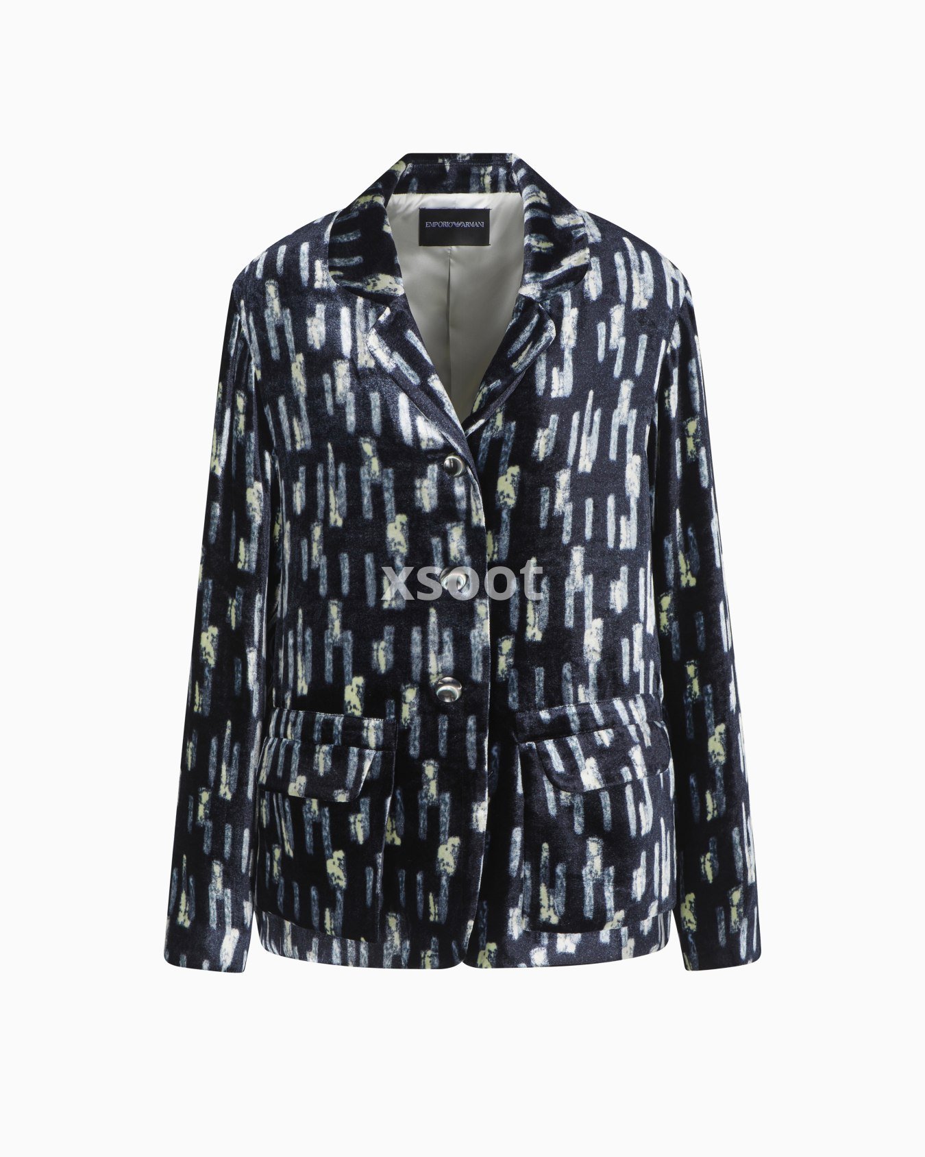 Single-breasted blazer with small lapels on the neckline and a front button placket, made of velvet with an all-over print. A key piece distinguished by its sophistication and elegance.