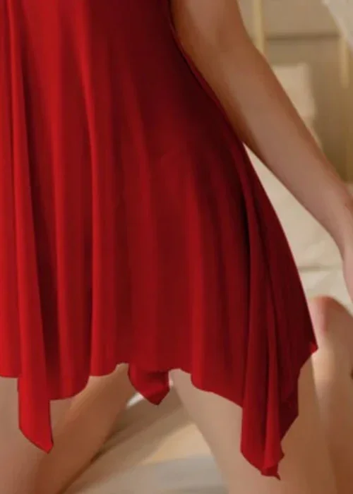 Features: Soft, flowing fabric for gentle wear Lace-detailed cups with light texture Heart charm accent at the neckline Handkerchief-style hem for a graceful drape Adjustable halter neck tie for a flexible fit Comes with a coordinated inner piece