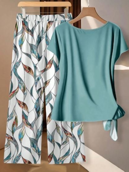 Upgrade your summer wardrobe with this stylish SHEIN 2-Piece Casual Minimalist Outfit Set in a refreshing green shade. This chic combo features a trendy bowknot shirt paired with loose straight-leg pants, designed with a modern geometric print for a fashionable yet effortless look.