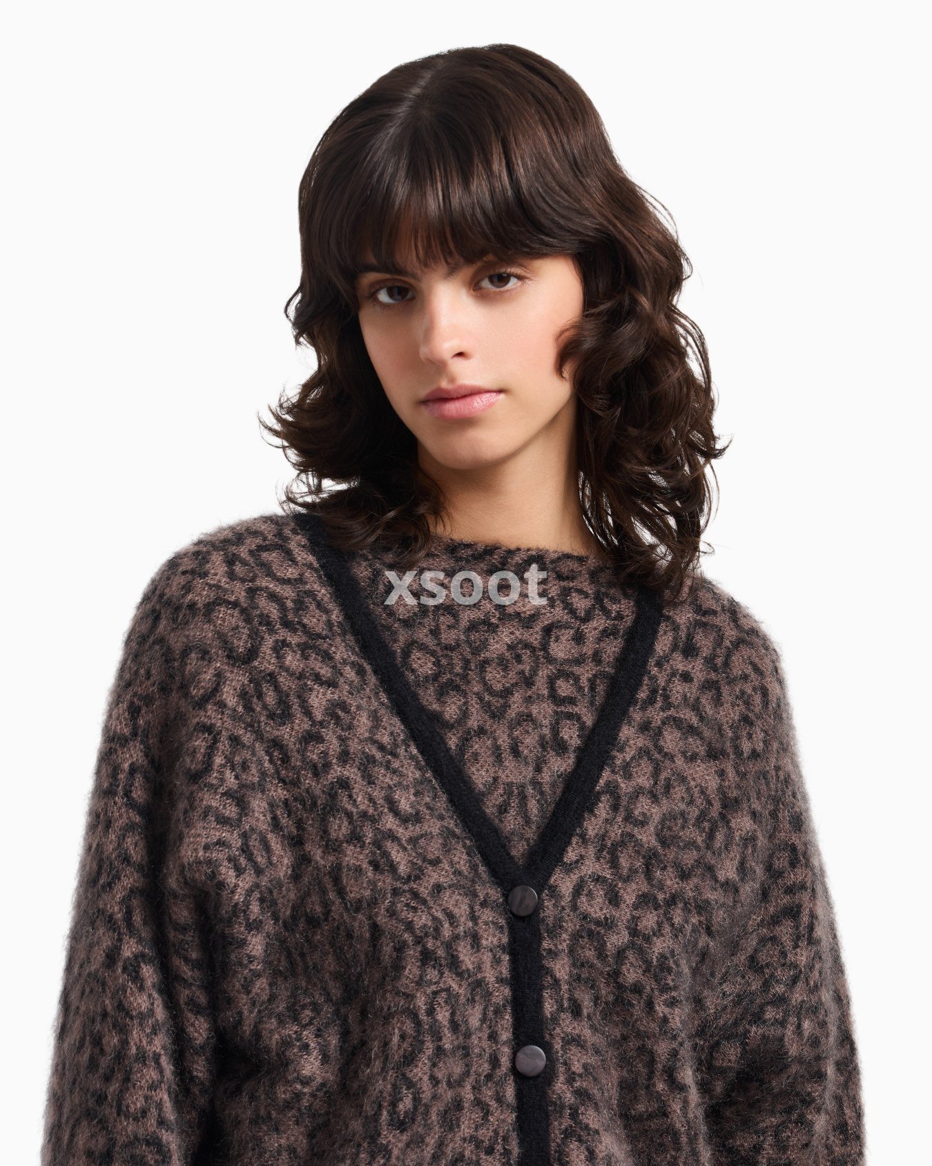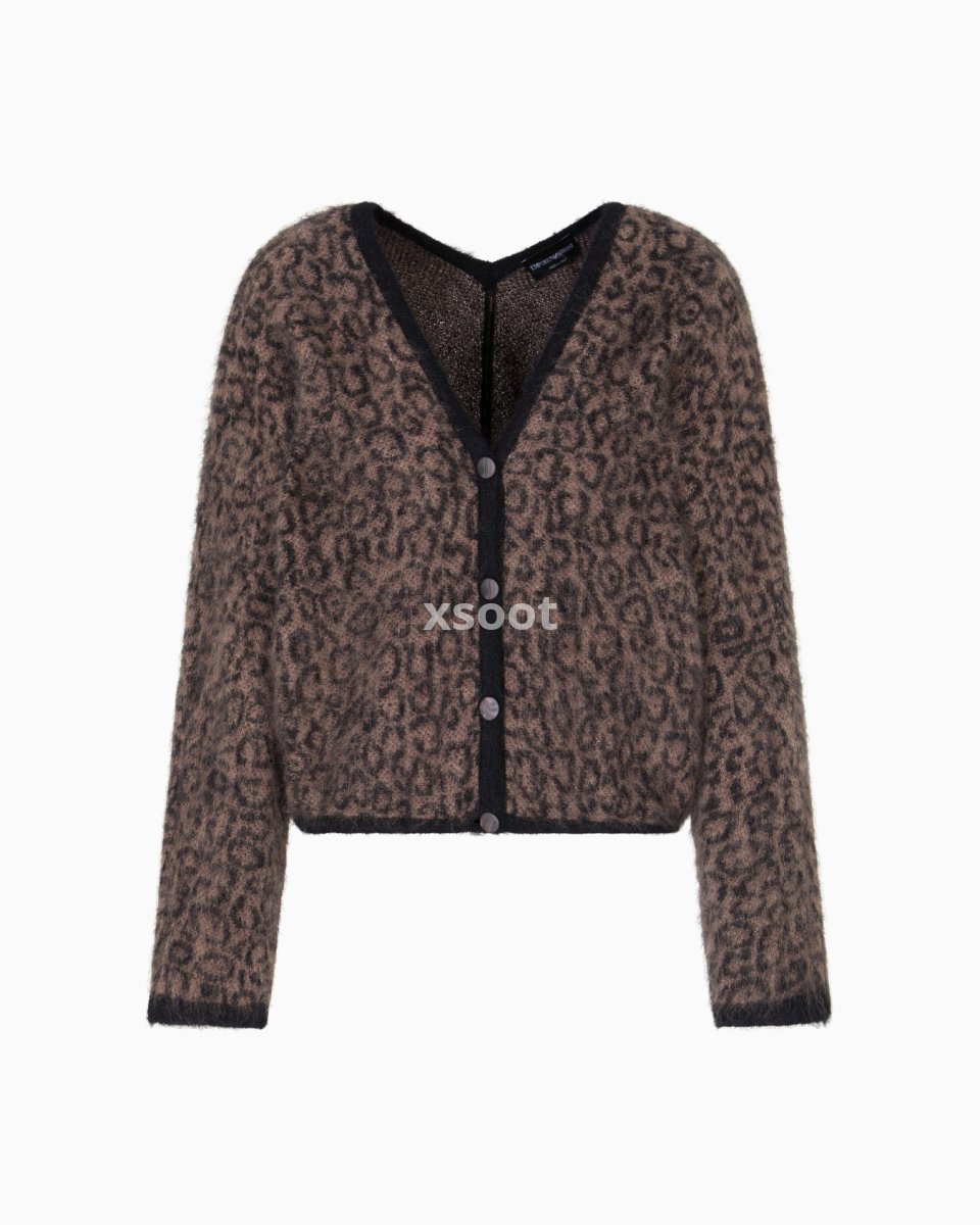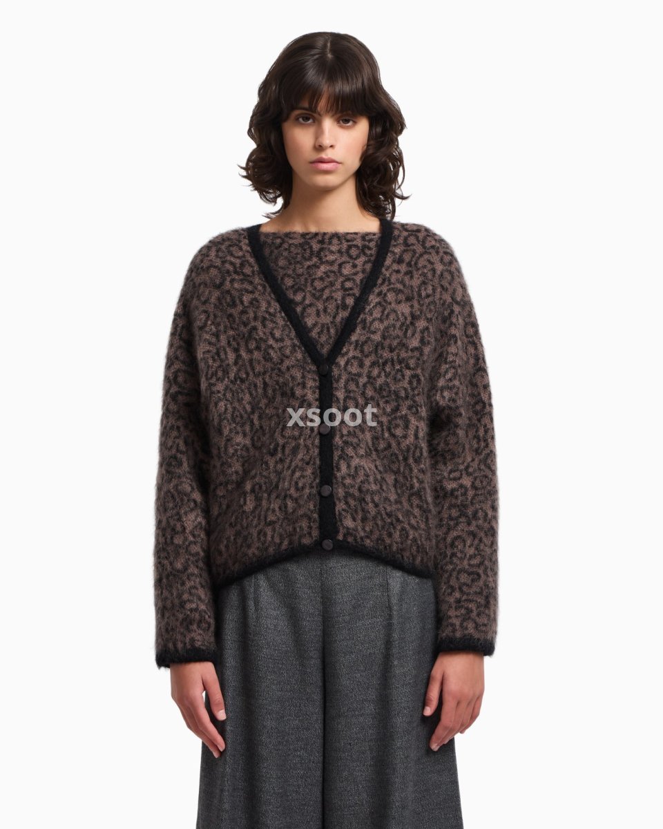 V-neck cardigan made from a mohair-wool blend with a warm, cocooning texture. The style with mother-of-pearl effect fastening buttons and long kimono-effect sleeves features an all-over jacquard pattern.