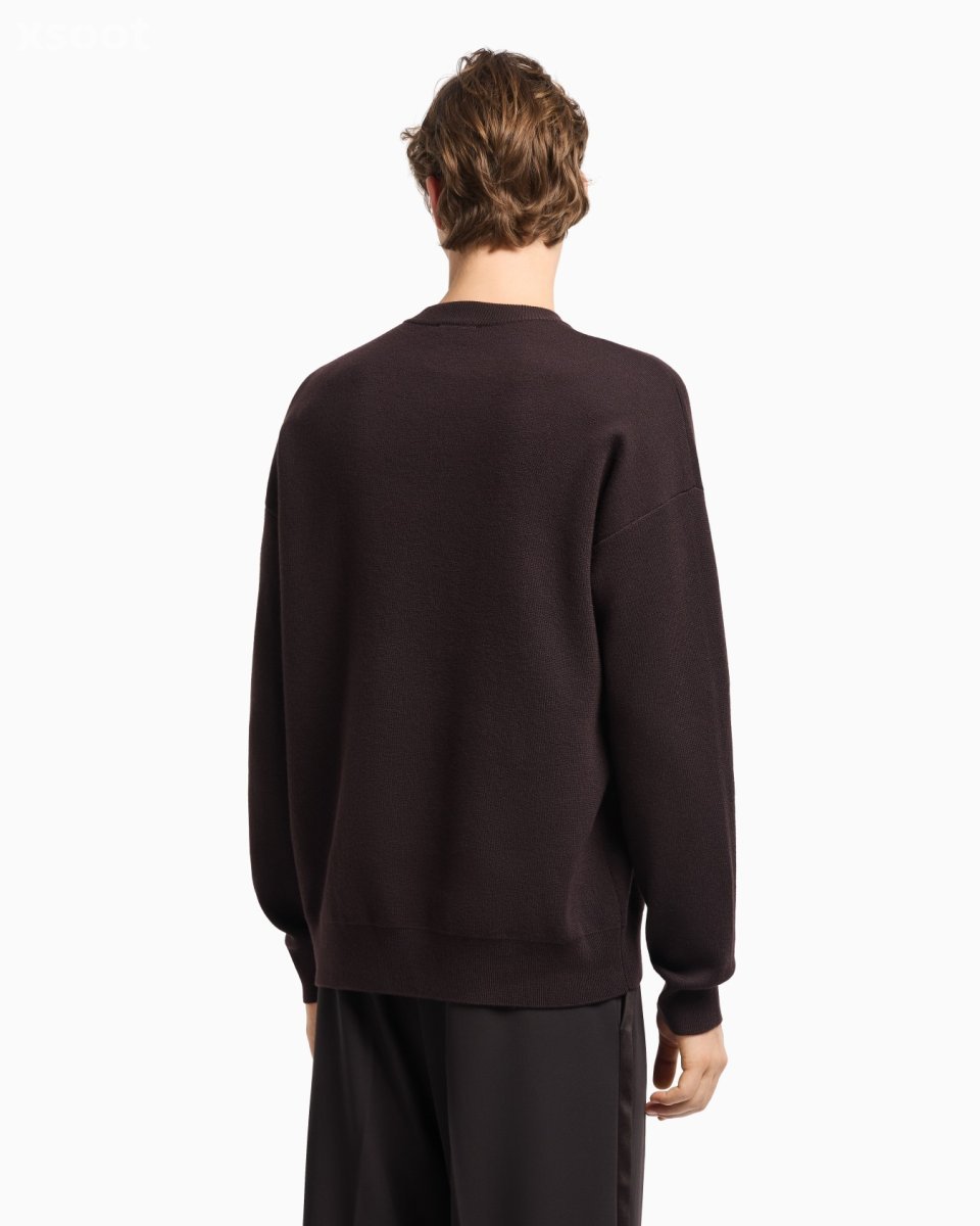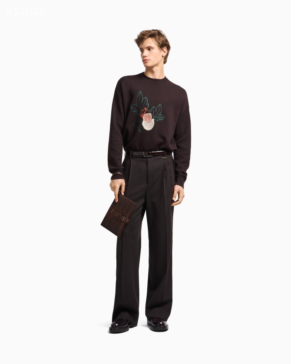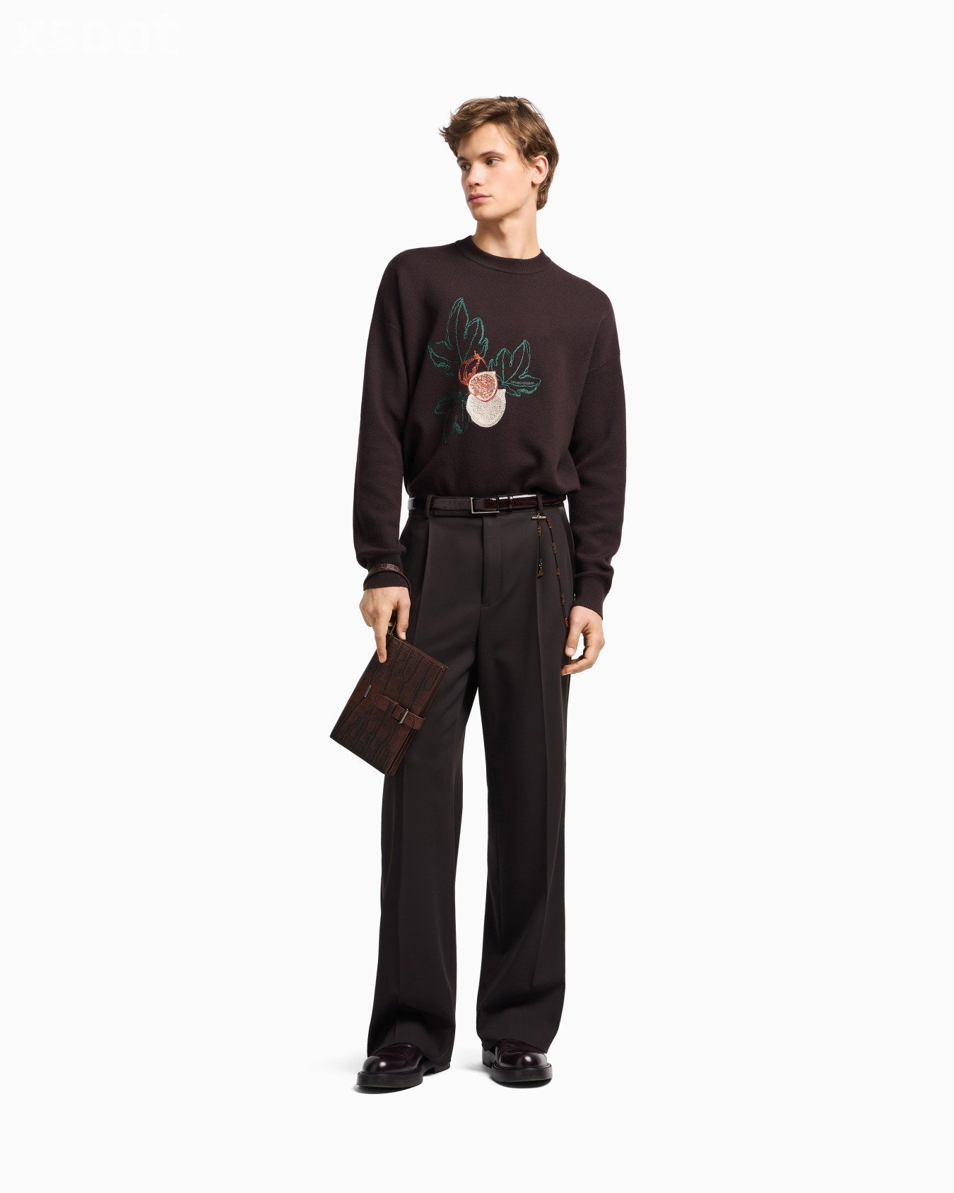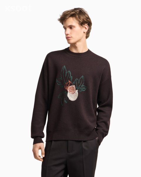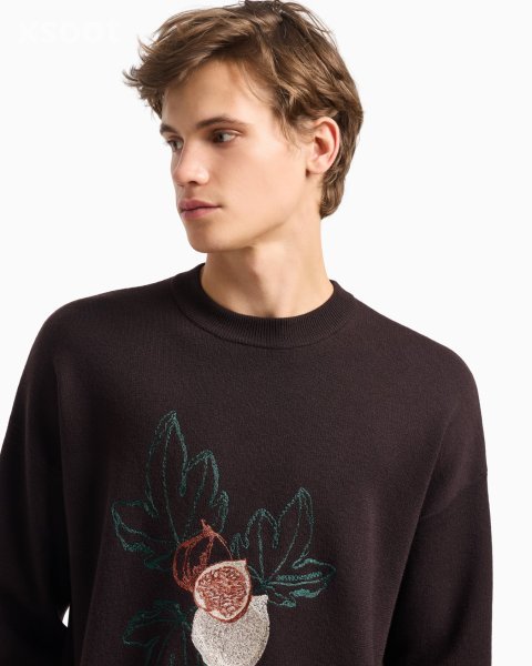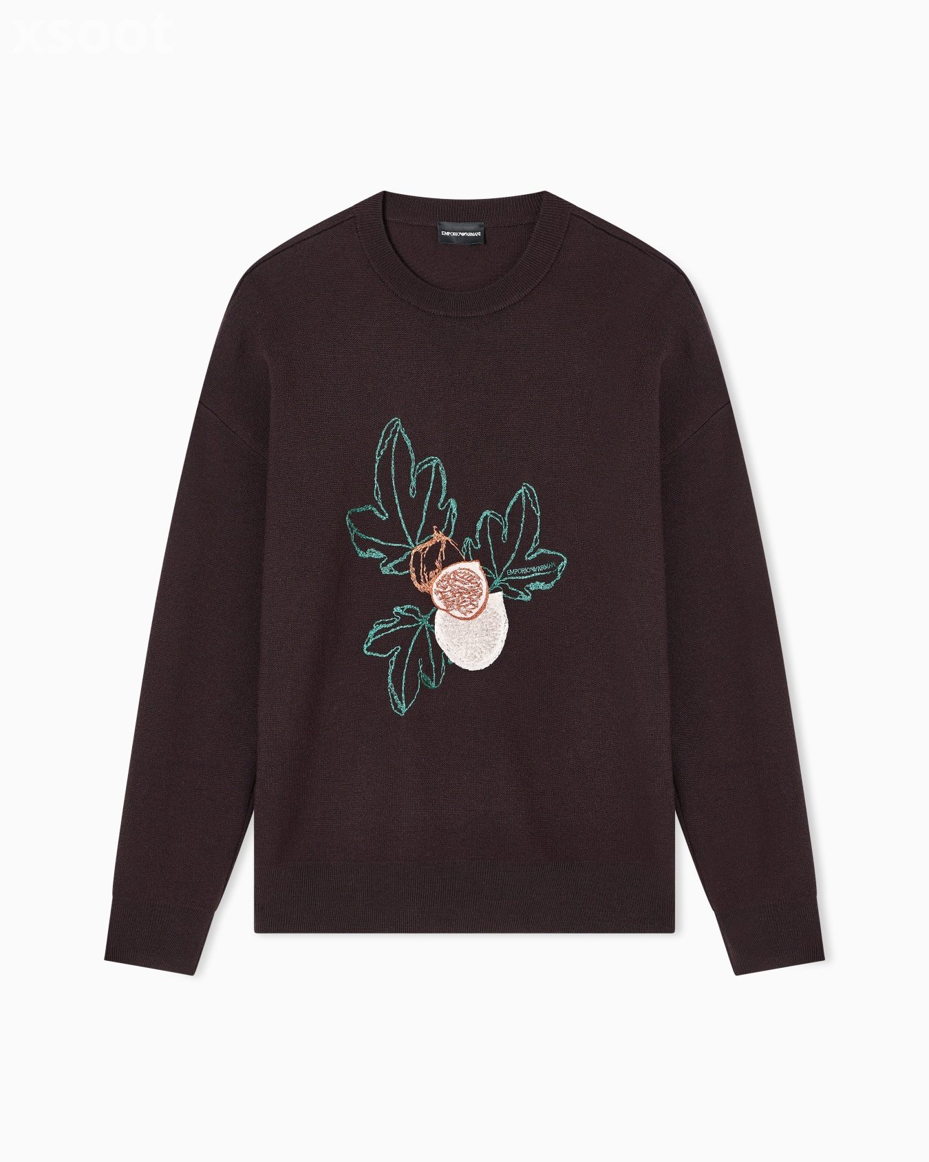 Plain-knit virgin wool crew-neck jumper with dropped shoulders. The garment is embellished with an oversized embroidery featuring figs and foliage, a still life that elegantly elevates it, making it suitable for casual and more formal moments.
