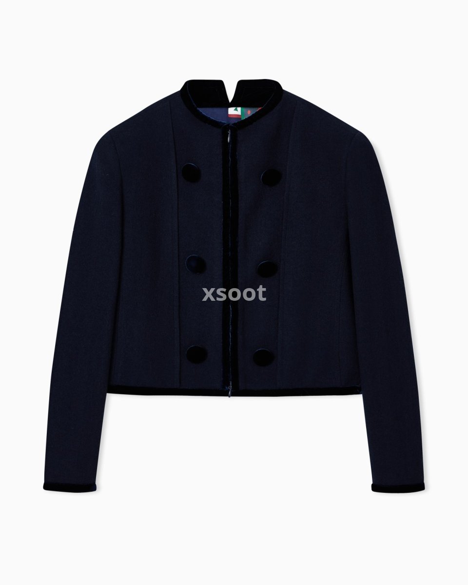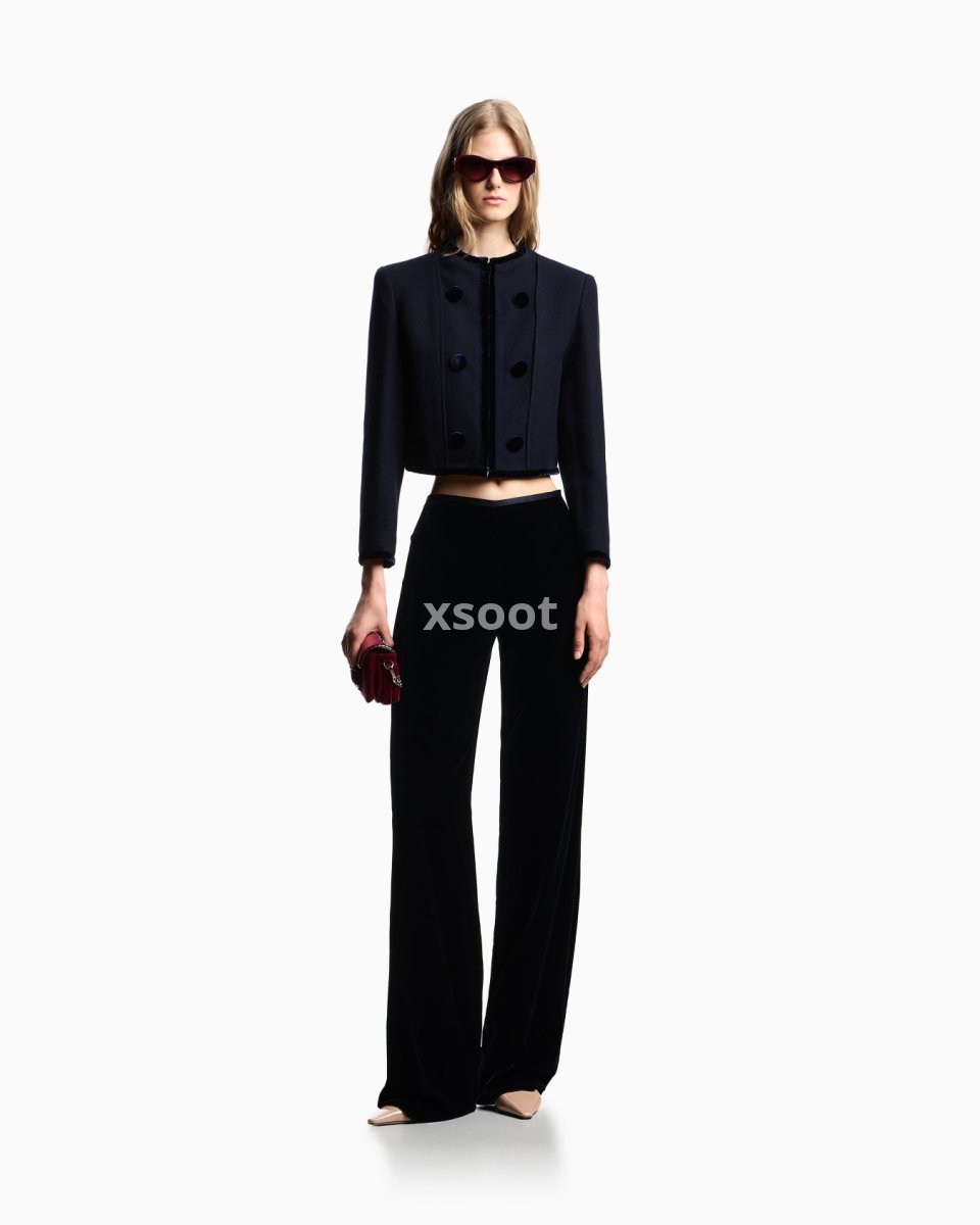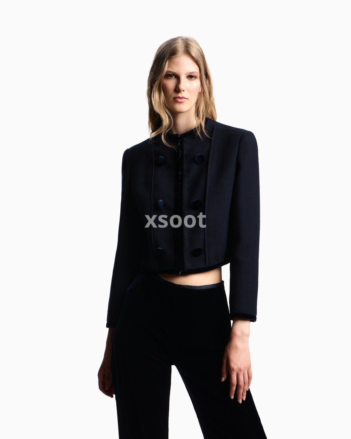 Washed virgin-wool crew-neck jacket with zip fastening and decorative buttons with a double-breasted effect. The style features a velvet trim and an inner lining with the collection print. This versatile style can be worn anywhere and with anything. The intriguing world of playing cards is the theme running through this season’s women’s collection. The Jeu de Cartes theme is playfully interpreted in different details of the collection: the elegance and refinement of Emporio Armani intertwine with the classic symbols of the playing-card suits, to create looks with a mysterious and sophisticated allure.