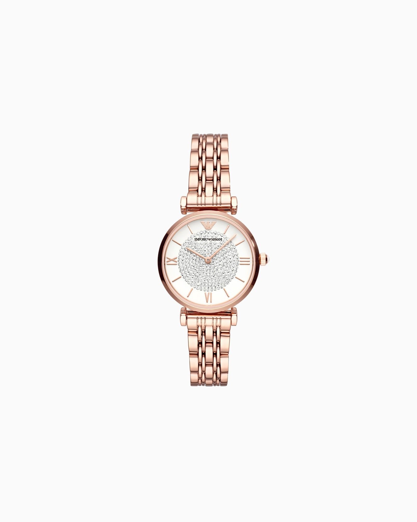32mm watch features a matte white dial with pavé stones, rose gold-tone Roman numerals and stick indexes, two-hand movement and rose gold-tone stainless steel bracelet.