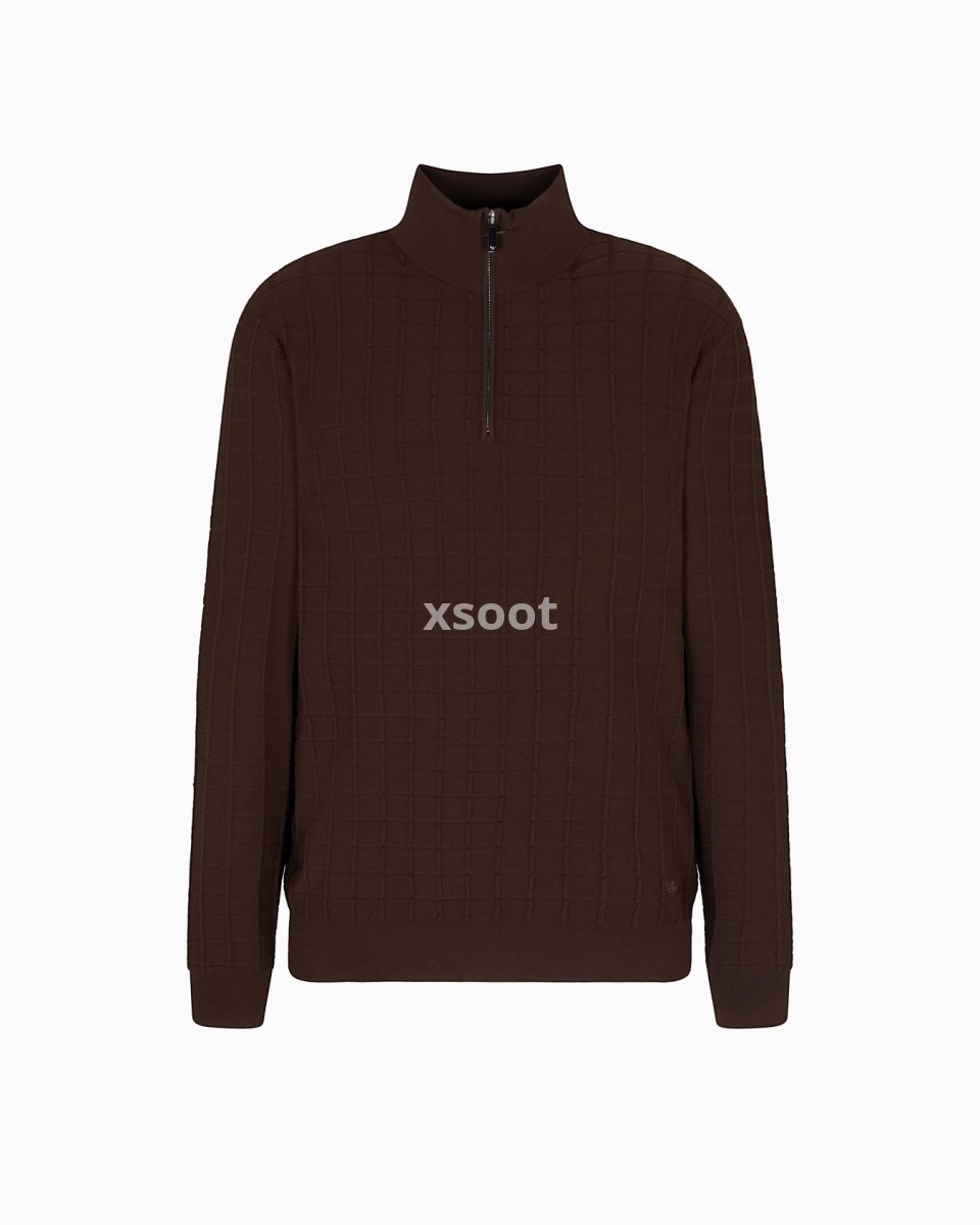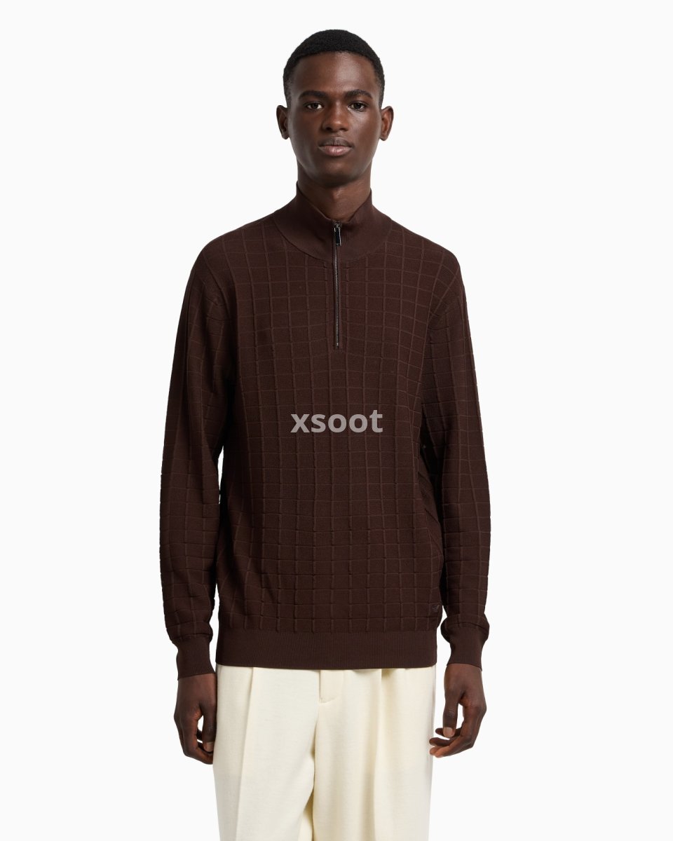 Jumper with a mock neck and practical partial zip. Made of a cosy viscose knit fabric that creates a slightly embossed 3D-effect check motif.