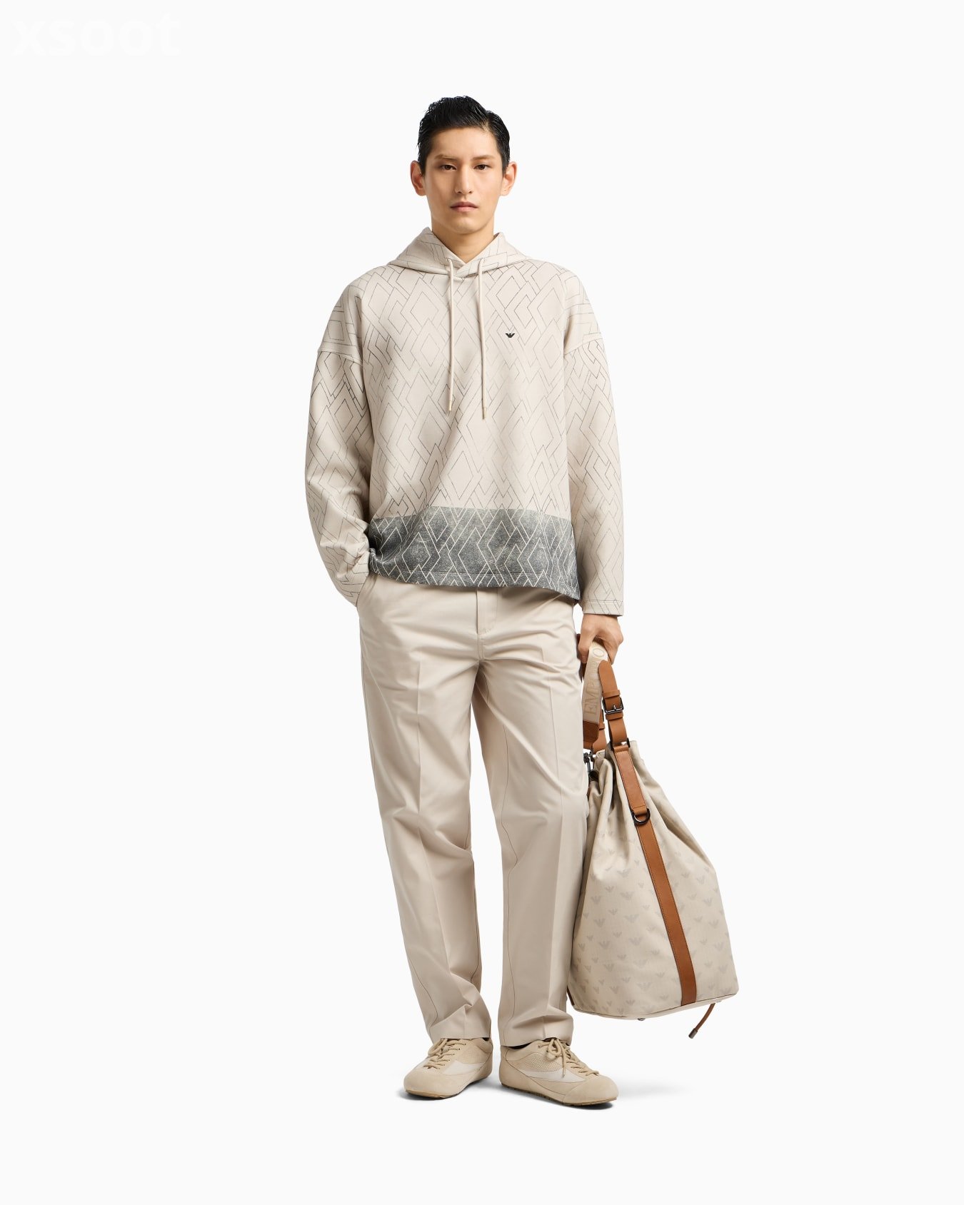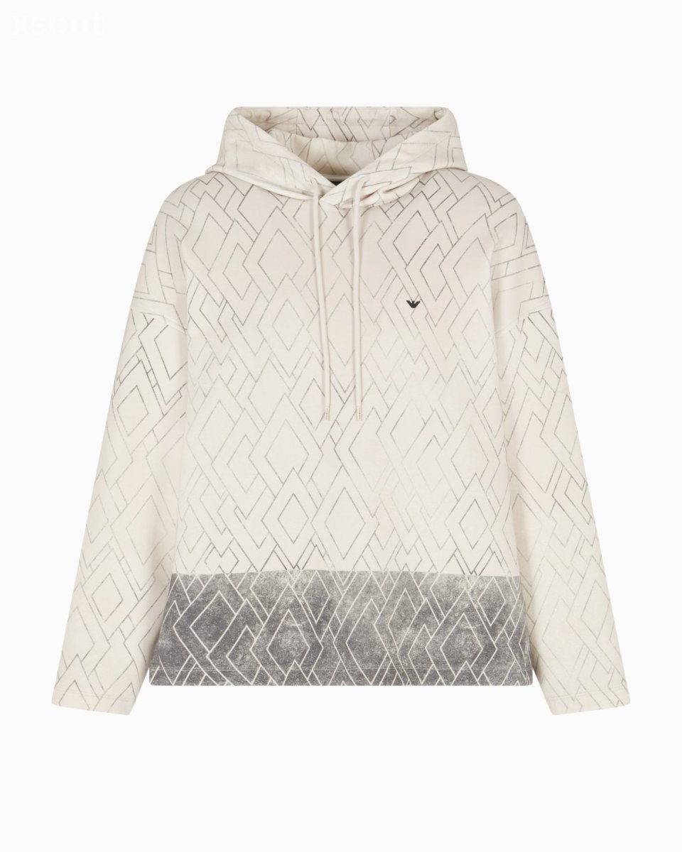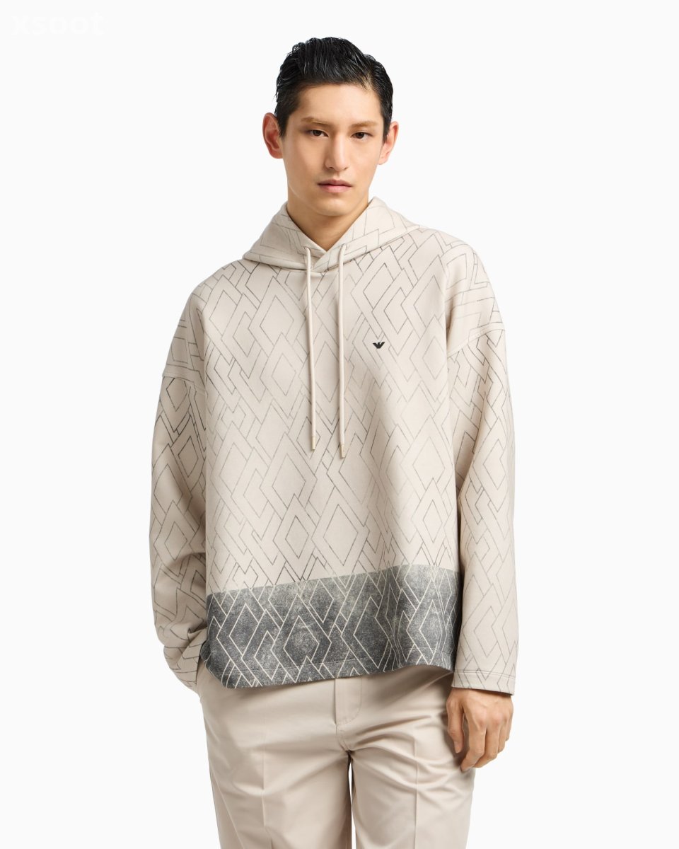 Cotton double-jersey sweatshirt featuring a drawstring hood. Featuring an all-over print and contrasting two-tone effect on the hem. The rubberised iconic eagle on the chest completes the piece with distinctive flair.