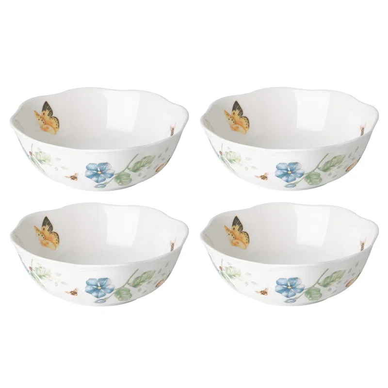 The classic Butterfly Meadow pattern decorates and shapes this 4-piece all-purpose bowl set with a gently scalloped rim and lively garden illustration. Ideal for holding snacks, these durable porcelain bowls are both microwave and dishwasher-safe.
