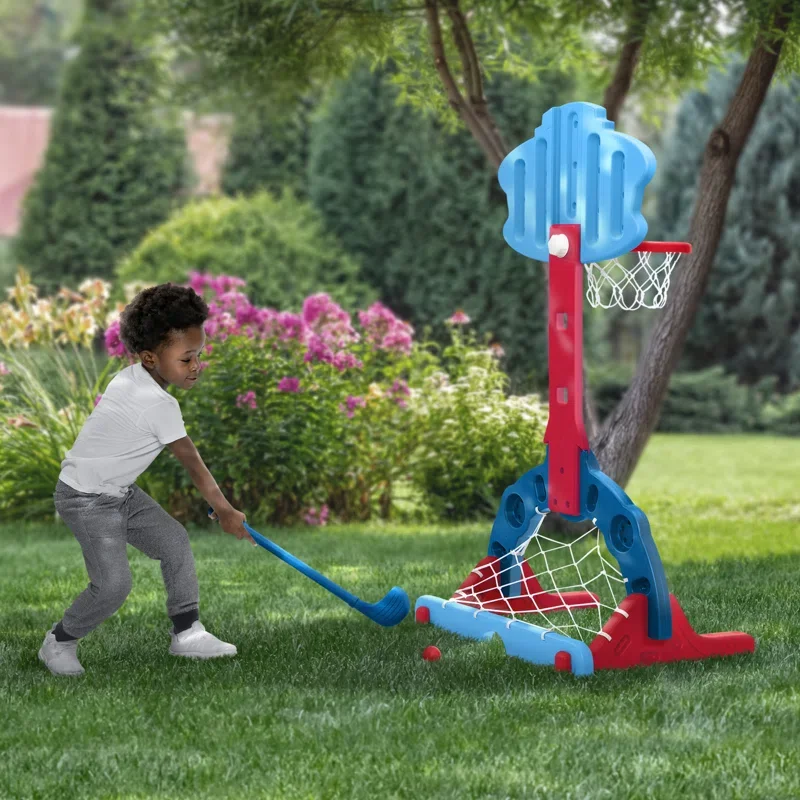- 4-IN-1 SPORTS CENTER: This sports set provides 4 games to play, so your toddler never gets bored | Choose from basketball, soccer, golf or hockey | Set includes basketball hoop, 1 basketball, 1 soccer ball, 2 golf/hockey clubs, 4 golf/hockey balls