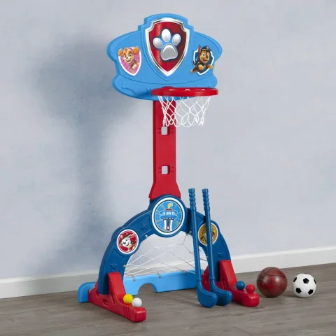 Game on! Tiny sports fans will love this 4-in-1 Sports Center by Delta Children. Designed to keep your little one active and entertained, this activity center features a basketball hoop, soccer/hockey net and golf game (basketball, soccer ball, two golf/hockey clubs and four golf/hockey balls included). It will also help develop social, motor skills and coordination as kids run, kick and score. The height can be adjusted between 40.35 inches and 51.38 inches to accommodate all ages and skill levels. Use inside or outside. Before play, add sand or water to the base for stability.