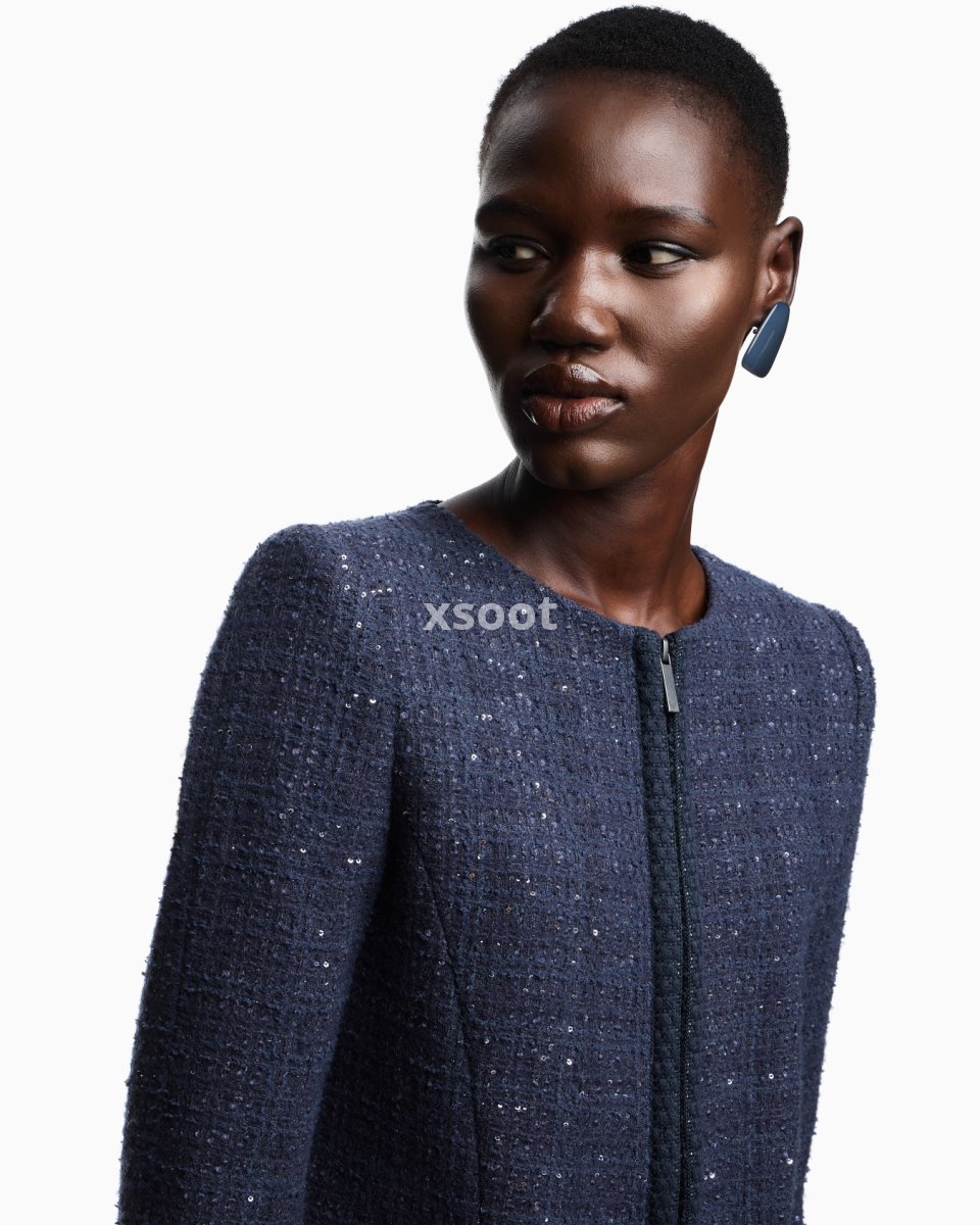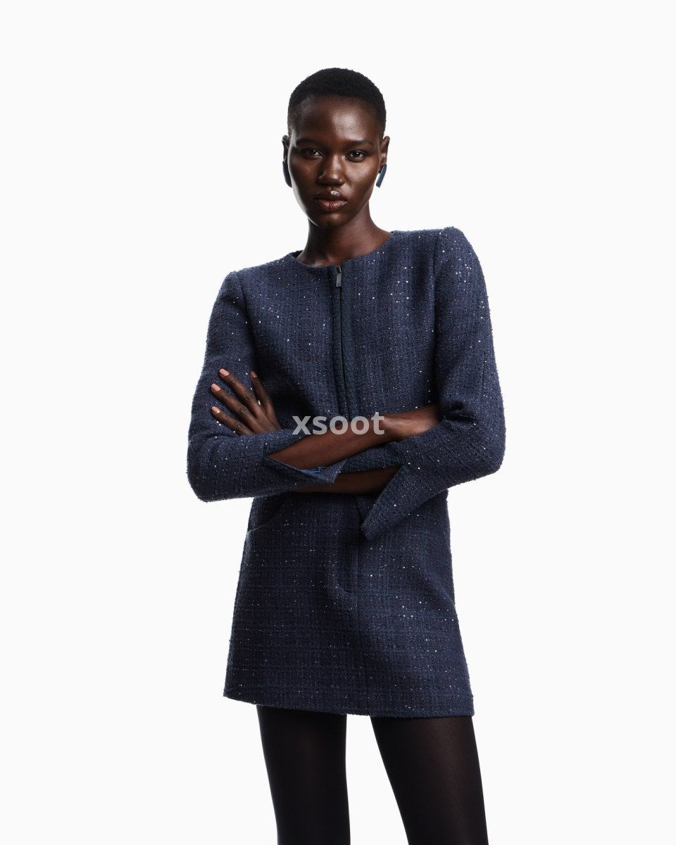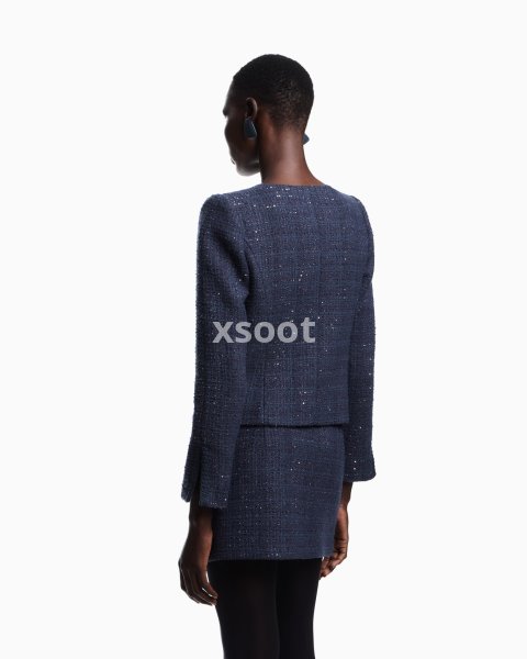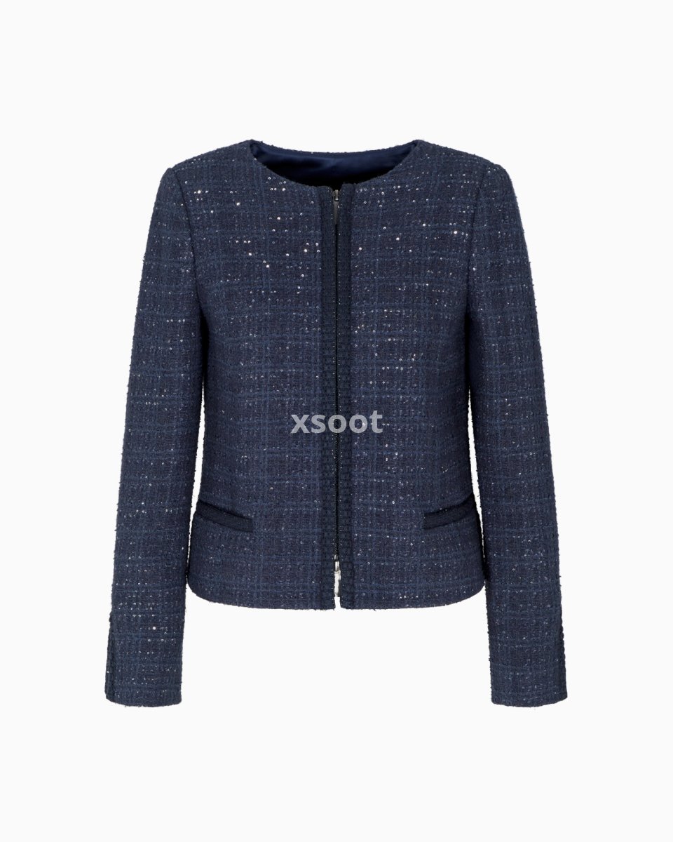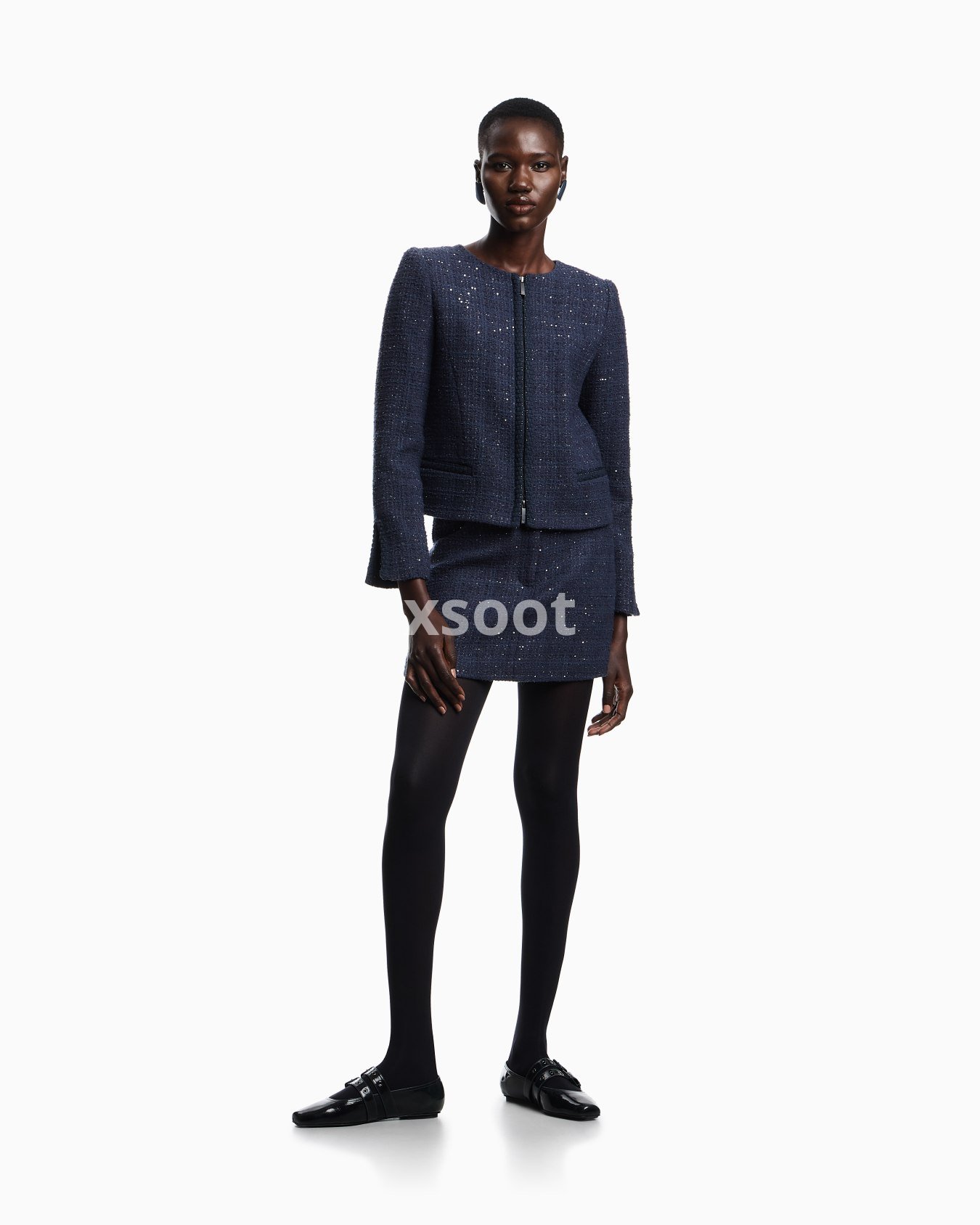 Jacket with a zip fastening, made of a wool-blend lurex tweed lit up by micro sequins. A feminine piece designed for evening looks that lends itself to completing daytime outfits with a sophisticated touch.