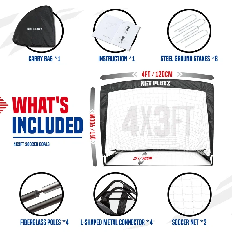 Set of 2 portable and foldable fiberglass soccer goals, easily set up with a quick twist, all-weather net, durable enough, easy to assemble, comes with carrying bag for easy transport, one assembly instruction manual and 8 stakes for stability. Squared structure and unique collapsible design, it can be used in multiple surfaces. Made fo high quality fiberglass frame constructino to support training on all levels.