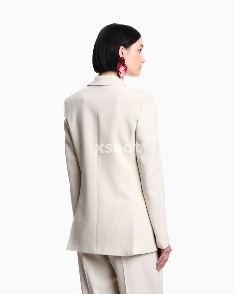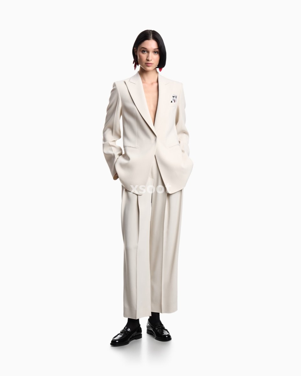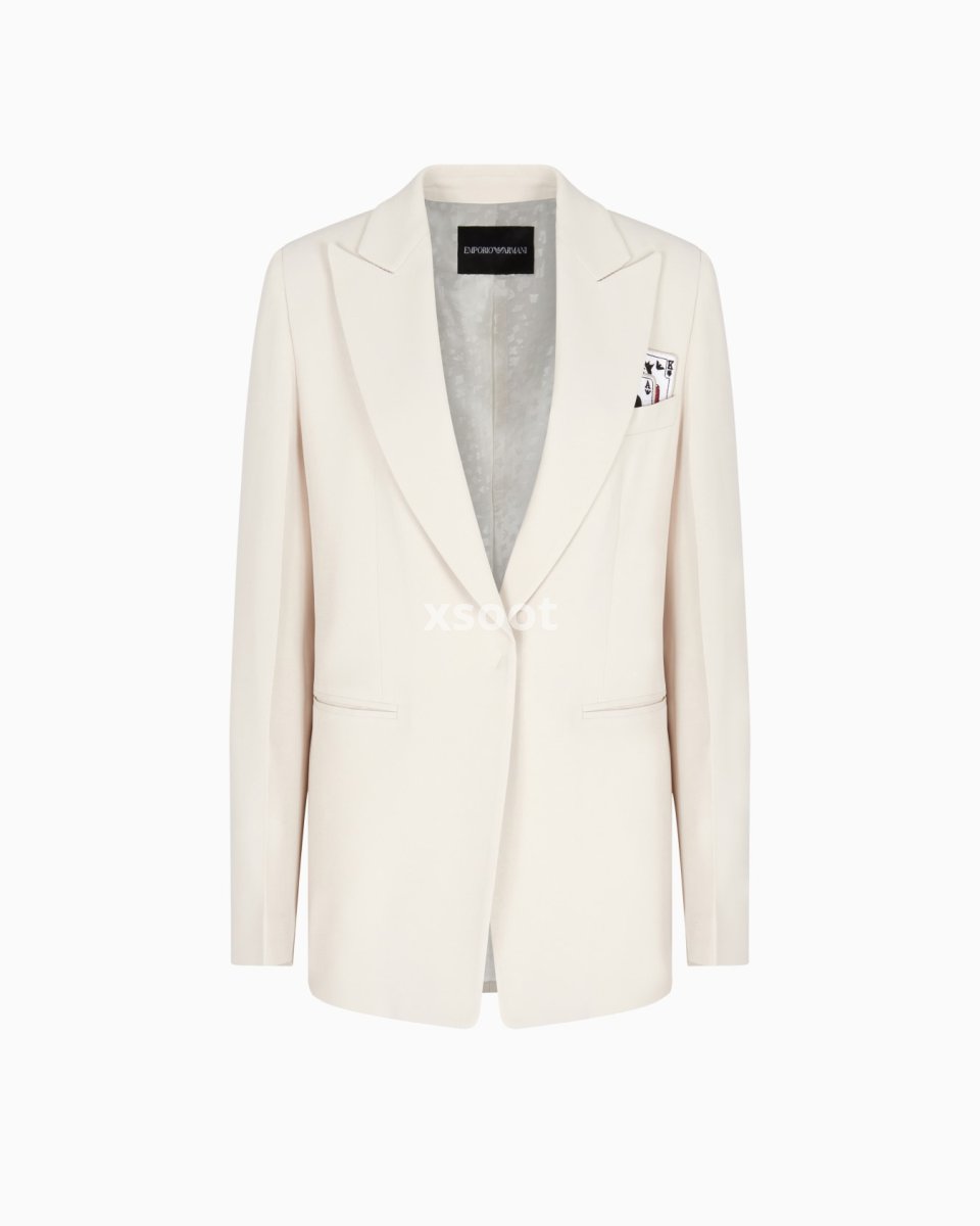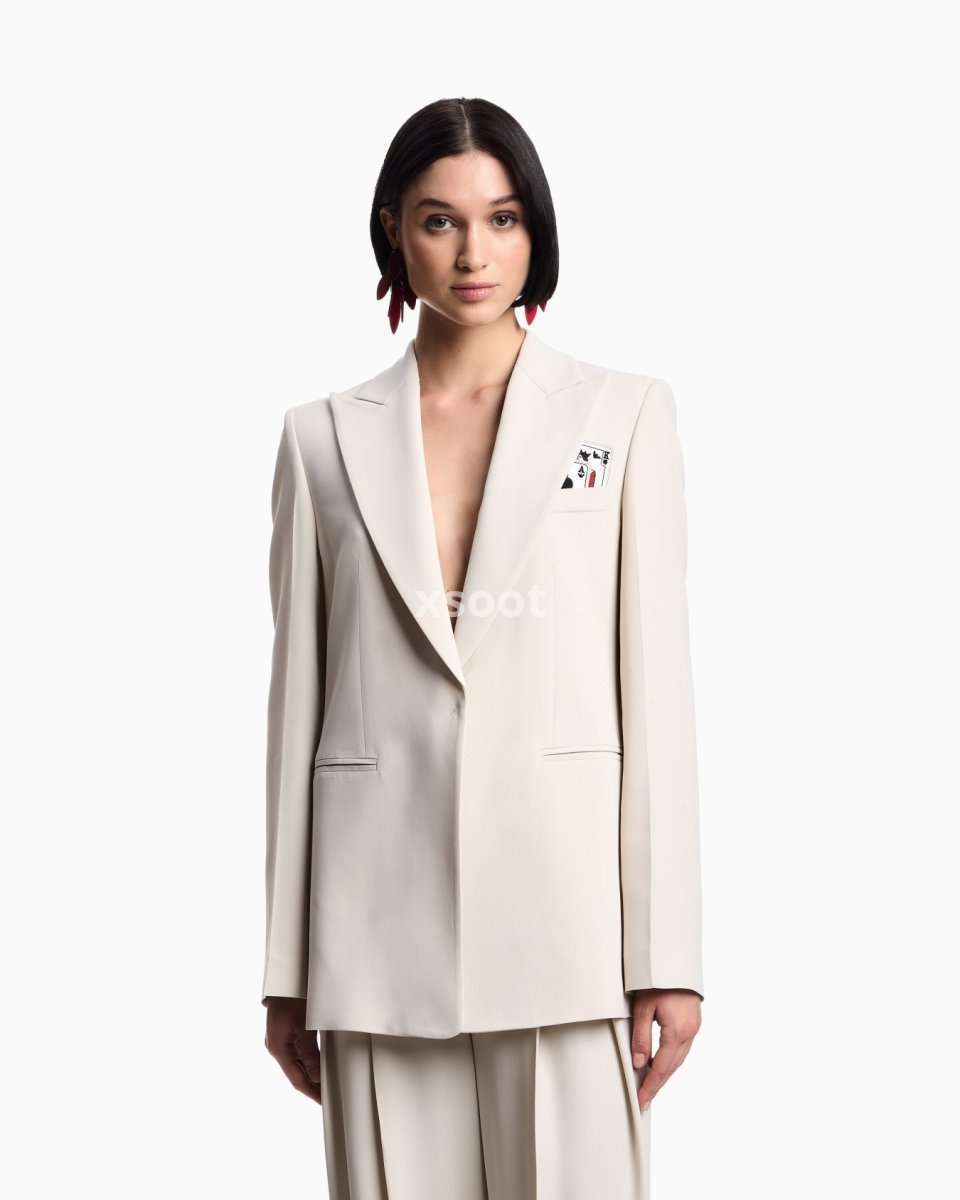 Single-breasted blazer with a peak lapel collar made of envers satin, a fluid fabric that glides softly over the silhouette. The style is distinguished by the removable playing-cards detail in the pocket-square pocket and the jacquard lining in the collection pattern. The intriguing world of playing cards is the theme running through this season’s women’s collection. The Jeu de Cartes theme is playfully interpreted in different details of the collection: the elegance and refinement of Emporio Armani intertwine with the classic symbols of the playing-card suits, together with intense and vibrant colours that combined with softer shades create looks with a mysterious and sophisticated allure.