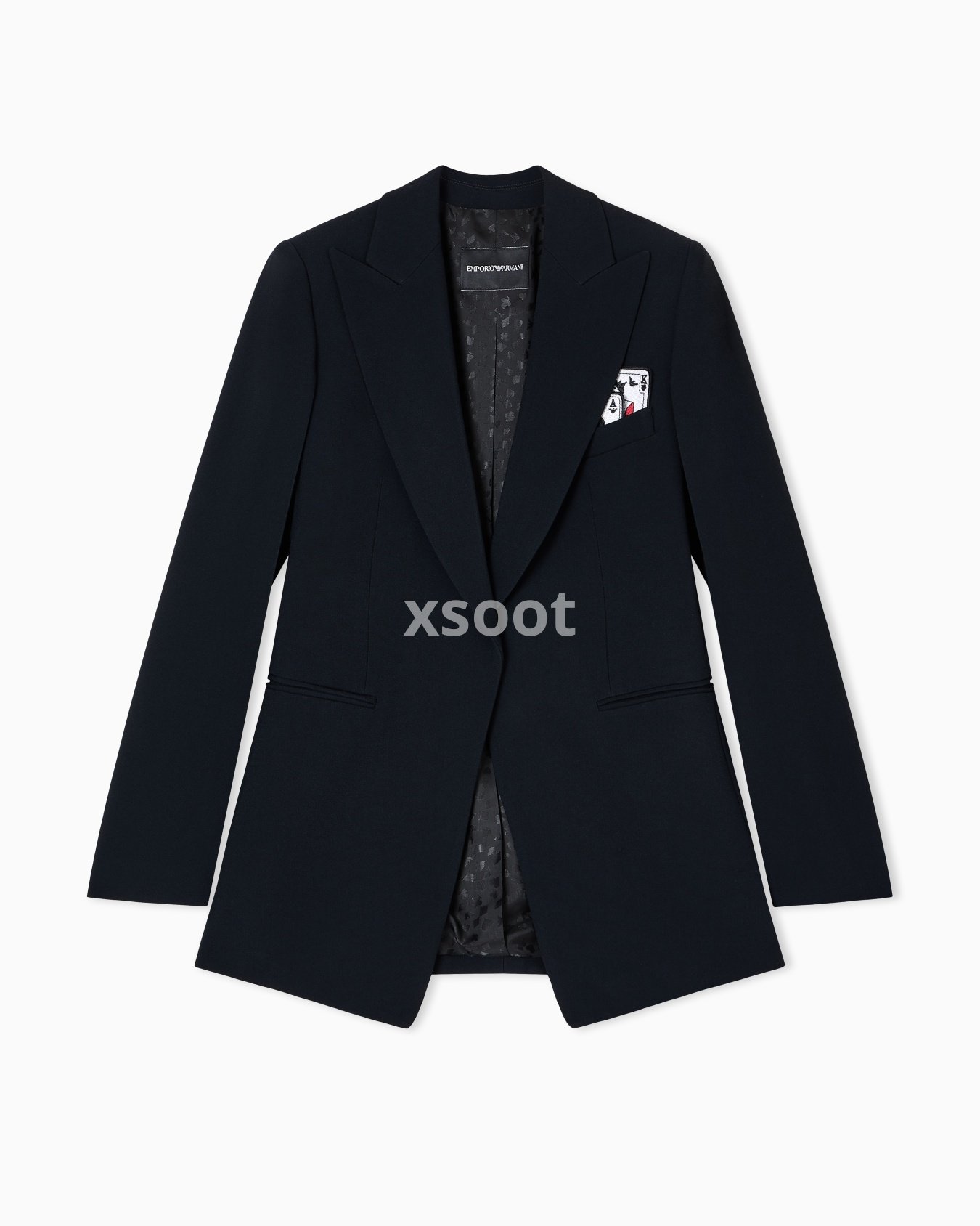 Single-breasted blazer with a peak lapel collar made of envers satin, a fluid fabric that glides softly over the silhouette. The style is distinguished by the removable playing-cards detail in the pocket-square pocket and the jacquard lining in the collection pattern. The intrigu...