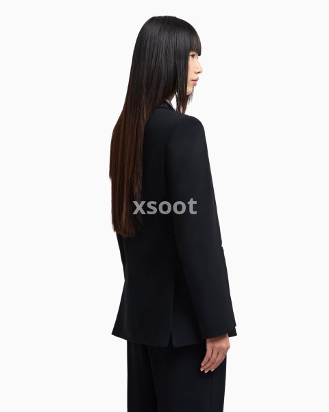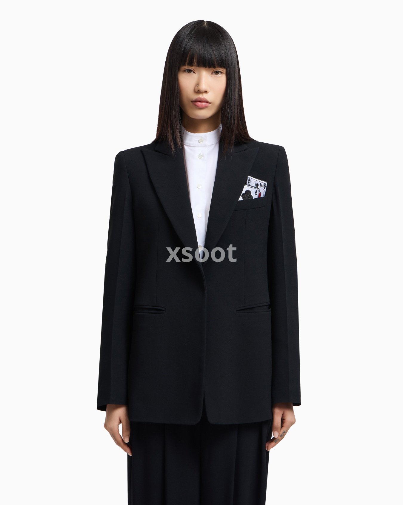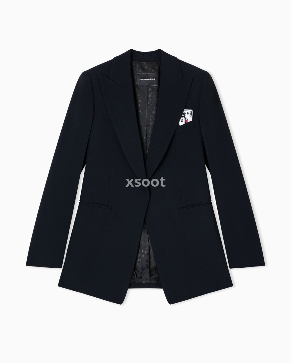 Single-breasted blazer with a peak lapel collar made of envers satin, a fluid fabric that glides softly over the silhouette. The style is distinguished by the removable playing-cards detail in the pocket-square pocket and the jacquard lining in the collection pattern. The intriguing world of playing cards is the theme running through this season’s women’s collection. The Jeu de Cartes theme is playfully interpreted in different details of the collection: the elegance and refinement of Emporio Armani intertwine with the classic symbols of the playing-card suits, together with intense and vibrant colours that combined with softer shades create looks with a mysterious and sophisticated allure.