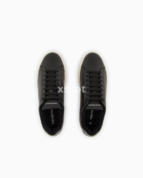 Cowhide sneakers with lace-up closure and enamelled eyelets matching the uppers. Logo back tab. These minimalist, modern sneakers are perfect for everyday city wear. Featuring the Emporio Armani logo on the side of the sole. Composition Upper shoe: 100% calf leath...