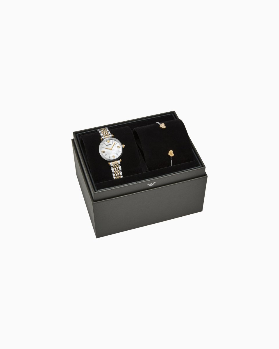 This 28mm two-hand watch showcases a captivating white mother-of-pearl dial. The two-tone stainless steel watch bracelet pairs perfectly with the double heart pale gold-tone flexi-bangle bracelet. The two hearts, one with crystal pavé and the other with polished finishing, are also featured on the lugs of the watch to tie the set together through even the most petite details.