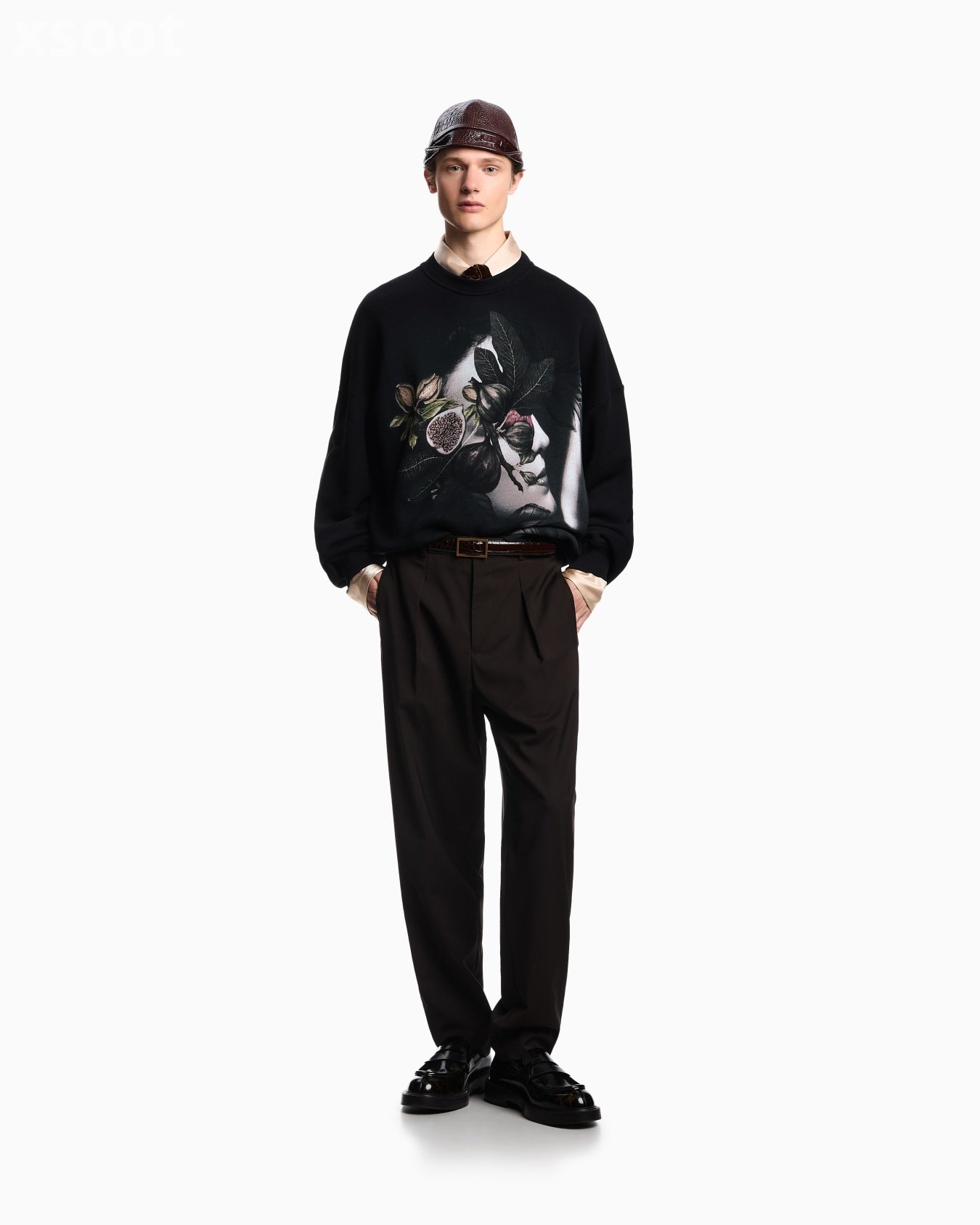 Crew-neck sweatshirt made from smooth cotton twill jersey with a typical diagonal weave. Embellished on the front with a print depicting retro-style outlines of a woman with blurred contours, and a figs and foliage motif, a still life that elegantly elevates a garment suitable for both casual and more formal occasions.