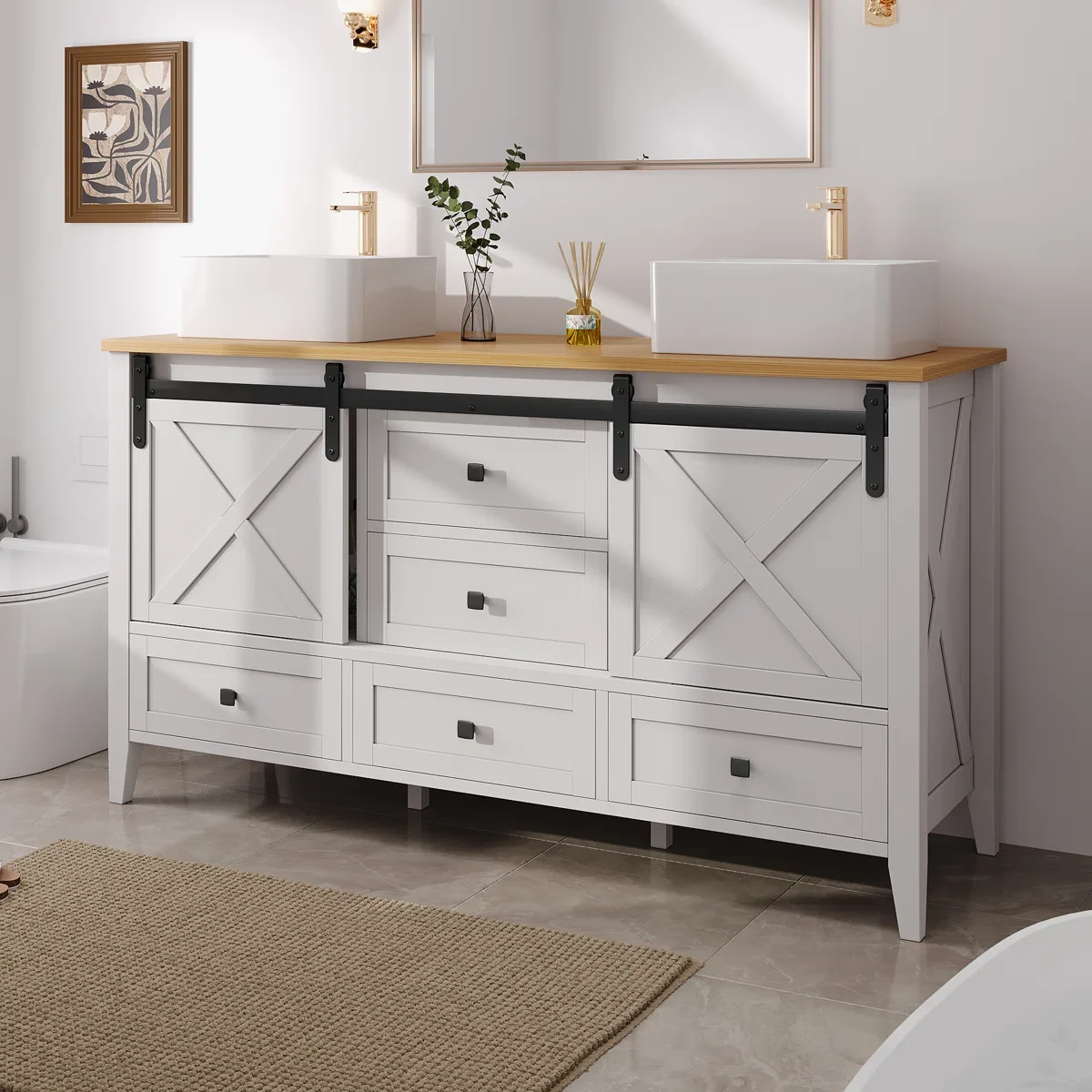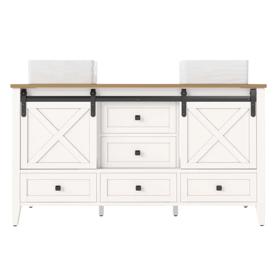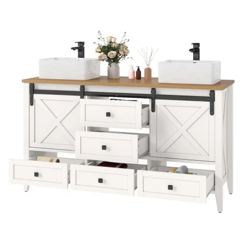 This 60-inch wide bathroom vanity seamlessly blends traditional farmhouse charm with modern functionality. The sliding barn door conceals hidden storage space, while five smooth-gliding drawers provide ample organization for towels and toiletries. The ceramic integrated sink offers both aesthetic appeal and lasting durability, making it an ideal choice for creating a warm and inviting bathroom atmosphere.