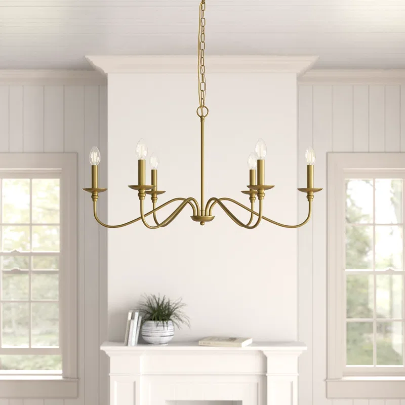 A dash of classic and contemporary, this 6-light smart-enabled chandelier is ready to illuminate your living room while making an industrial-meets-farmhouse statement with its dramatic and curvy arms. It's crafted from metal with a dynamic finish of your choice, and it features candlestick holders that connect to the exposed 40W max bulbs (sold separately). We recommend getting flame-look bulbs to enhance the vibe. This chandelier hangs with the help of a height-adjustable chain and a canopy that's compatible with sloped ceilings. You can also control the dimming function through an app on your phone.
