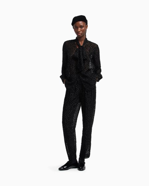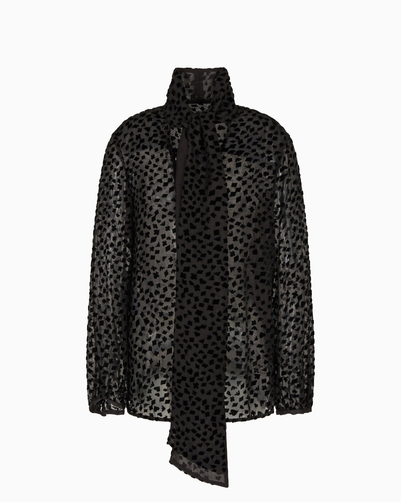 Shirt with tie flaps that create a signature foulard collar. This piece is made of tulle with a devoré velvet collection pattern. The intriguing world of playing cards is the theme running through this season’s women’s collection. The Jeu de Cartes theme is playfully interpreted in different details of the collection: the elegance and refinement of Emporio Armani intertwine with the classic symbols of the playing-card suits, to create looks with a mysterious and sophisticated allure.