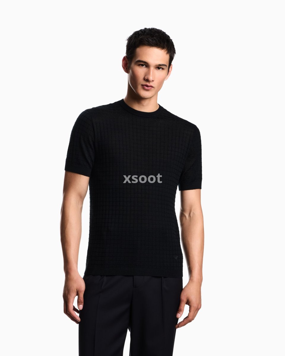 Short-sleeved, crew-neck jumper in a plain and purl knit, creating a check-like op-art texture. Made in a wool and Lyocell blend. Lyocell is a semi-synthetic fibre that has an exceptionally low impact on the environment. It is derived from eucalyptus trees and is renowned for being very durable, breathable, absorbent and wrinkle-proof.