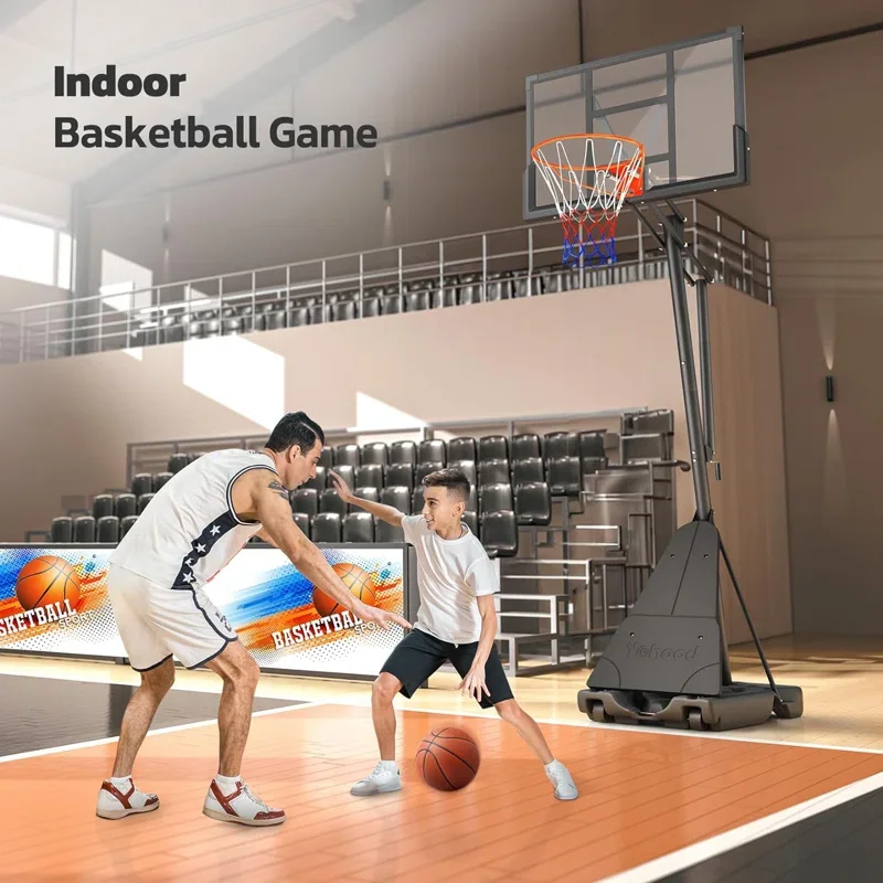 - [PORTABLE BASKETBALL HOOP]: With 2 durable wheels, the portable basketball goal system can be moved for indoor or outdoor use. Tilting it, you can push it to backyard, driveway or to an indoor gym for a good game of basketball with your families, friends and enjoy exercise time.