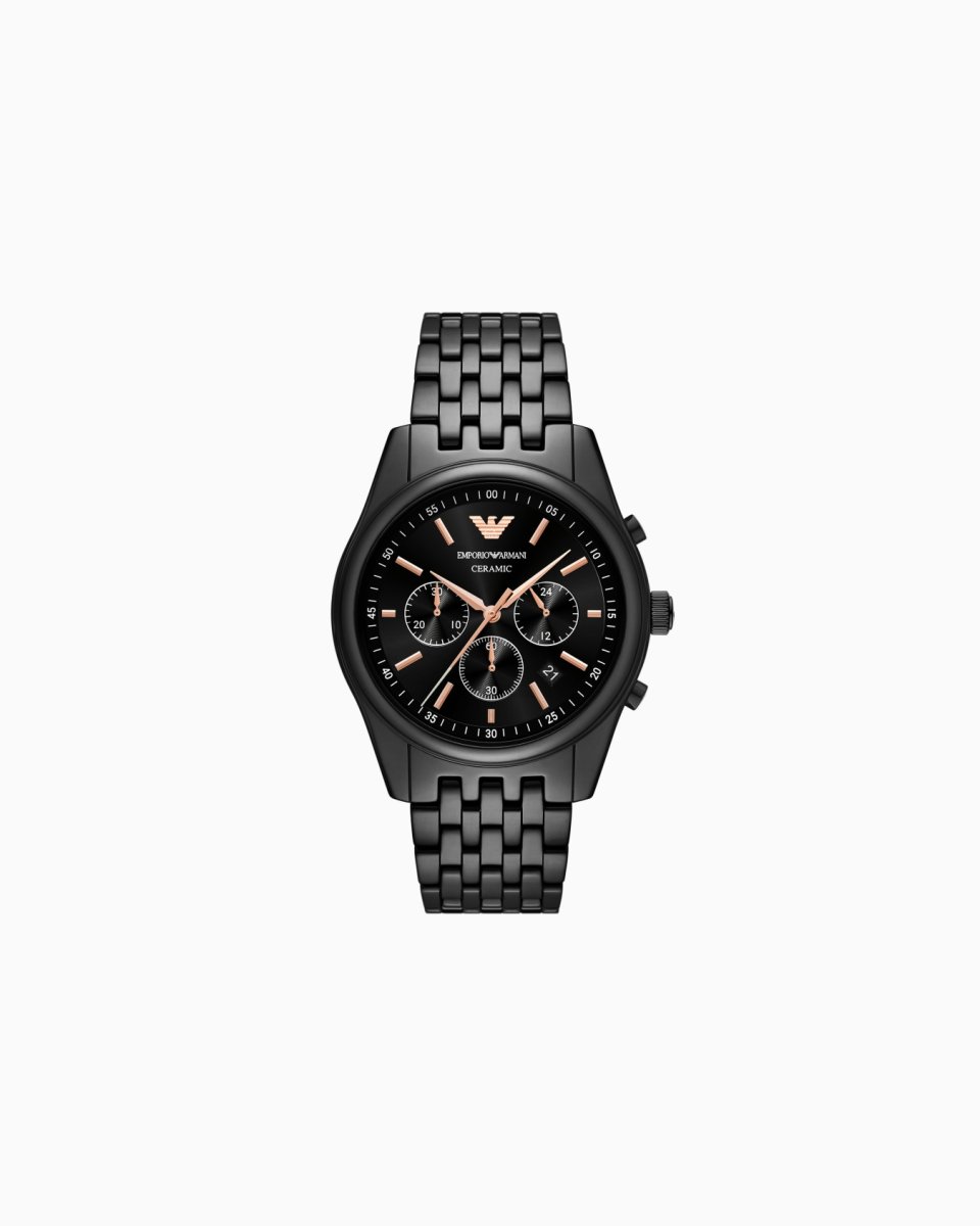 Crafted entirely from black ceramic, this 43mm chronograph watch showcases a seamless monochromatic design with rose gold-tone accents. The black sunray dial features three sub eyes, coupling functionality and visual intrigue for a stand out silhouette.