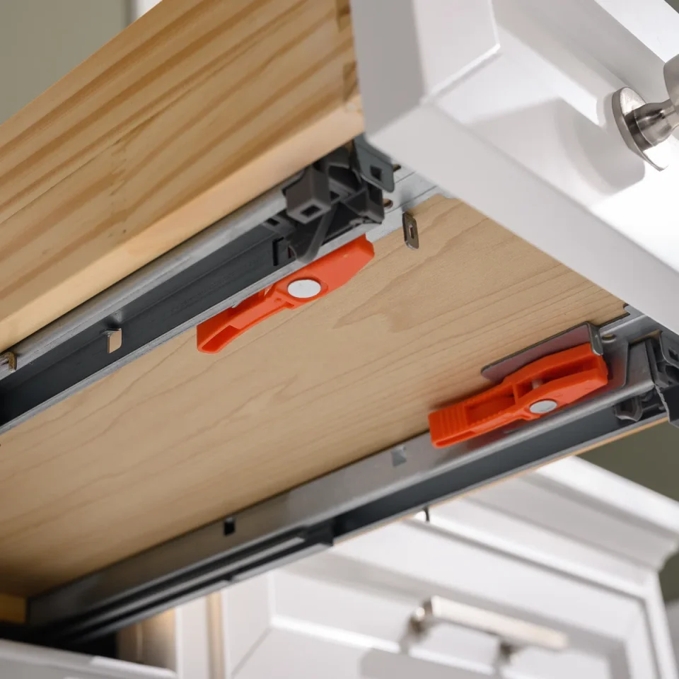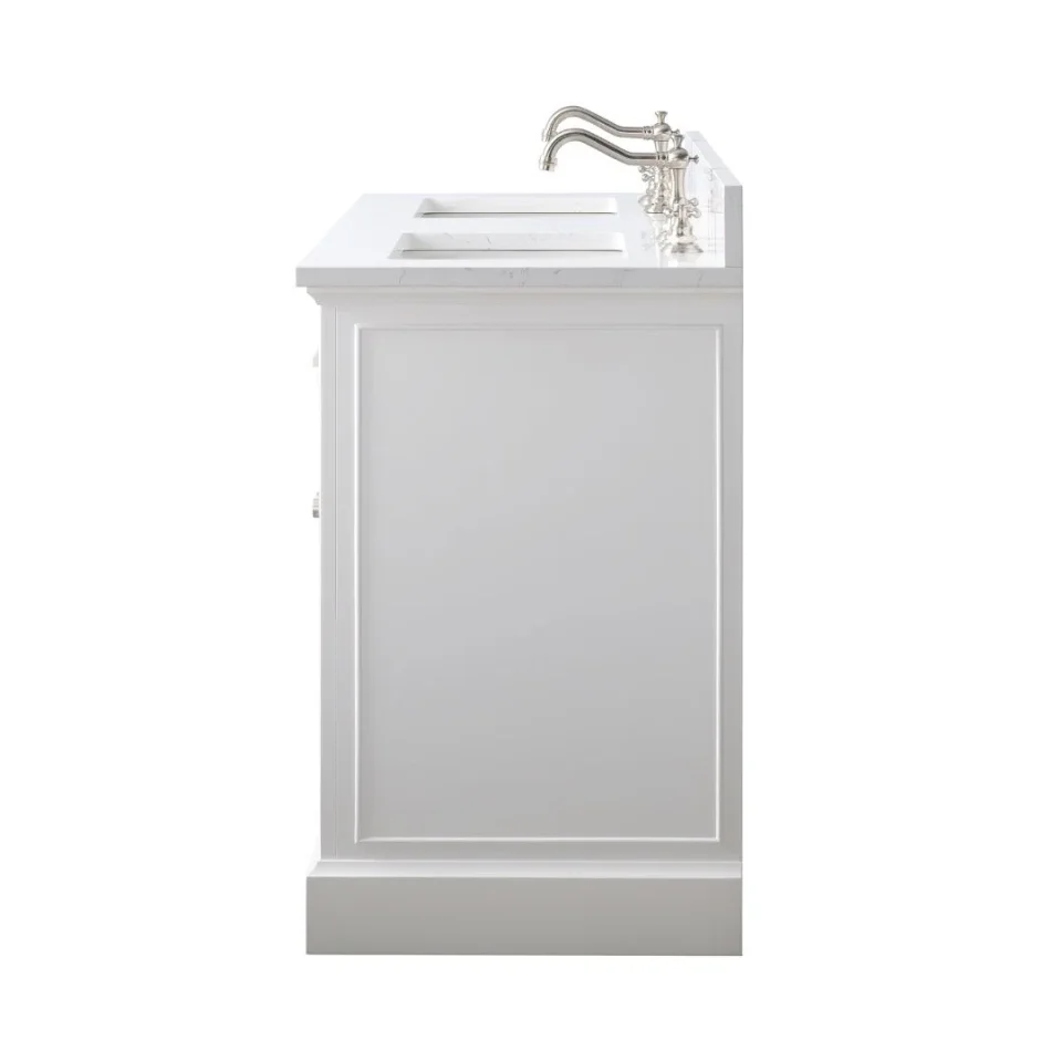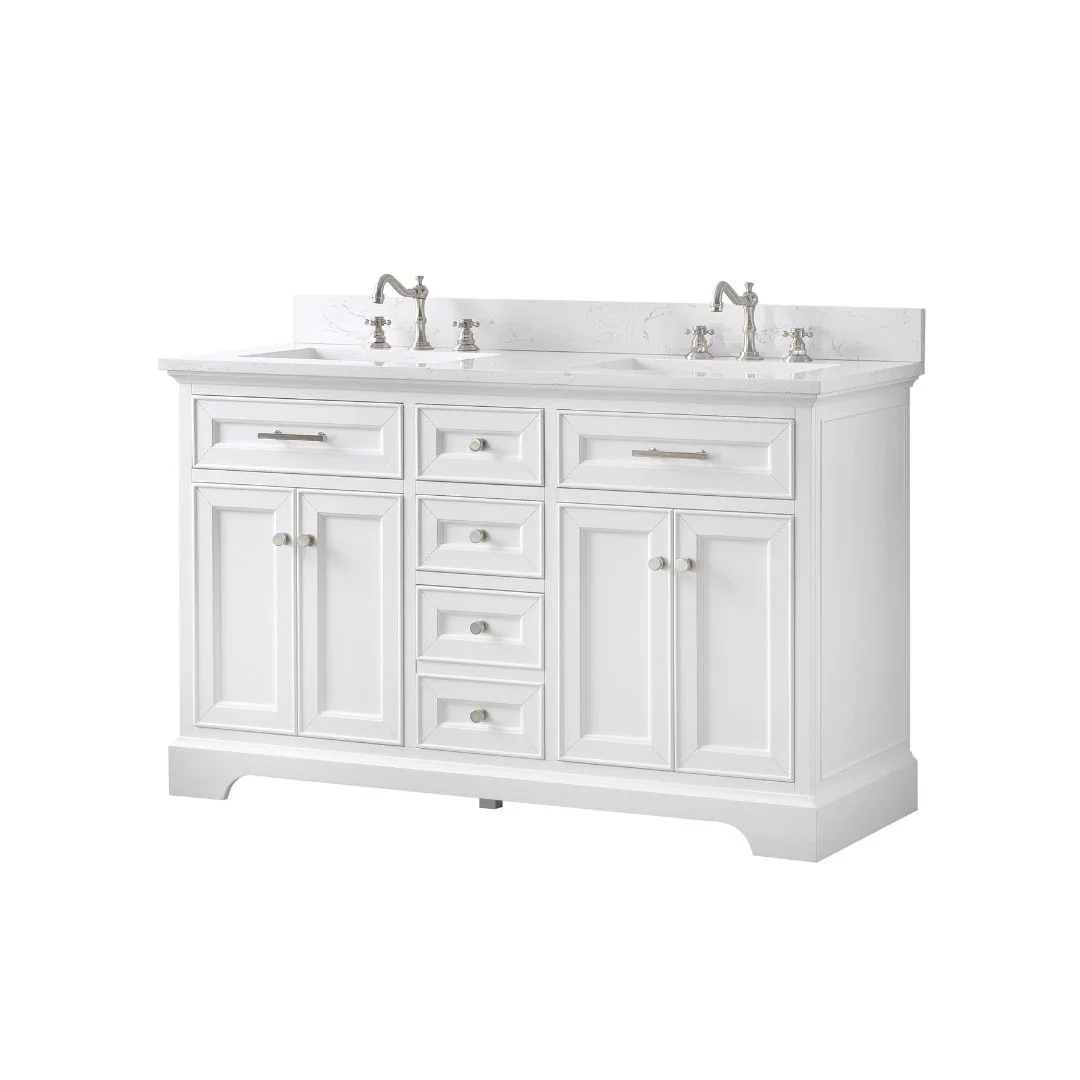 This classic double-bathroom vanity set features clean lines and plenty of drawer space for all your makeup, toiletries, and cleaning supplies. Its wide 54" design is made from solid poplar wood in a neutral finish, and its surface is crafted from engineered stone in a Carrara white finish that complements your contemporary décor. The two included undermount sinks are made from ceramic, and they boast a rectangular silhouette. The six indented drawer fronts come with handles in a brushed nickel for Taupe white, gray, and silver gray finishes and brushed gold for evergreen and indigo blue finishes. The drawers open up to reveal space for washcloths, toothpaste, and hair ties. And the four matching doors with rounded knobs hide extra shelf space for hairdryers and bath towels. Plus, this bathroom vanity comes with a backsplash to help protect your walls.