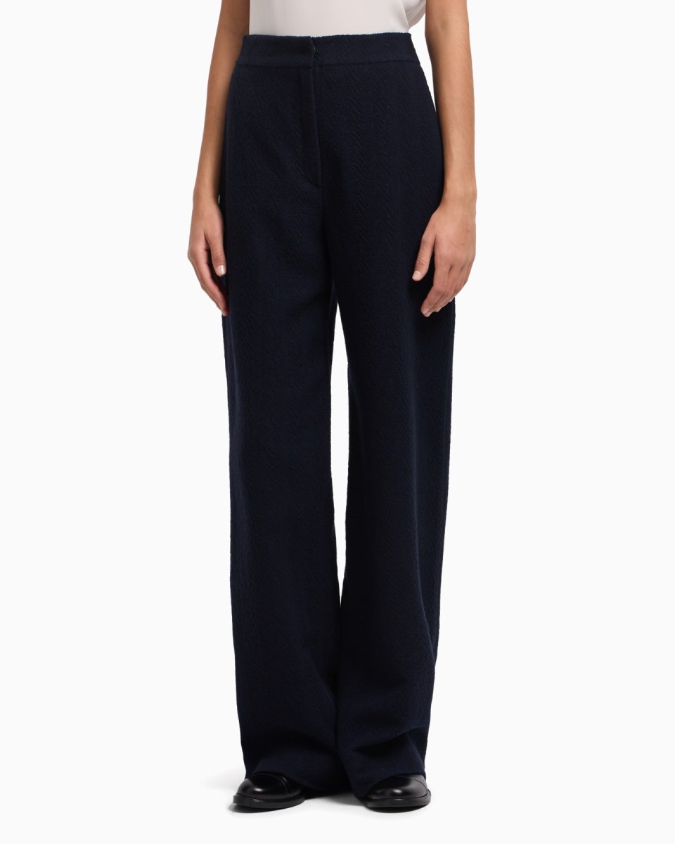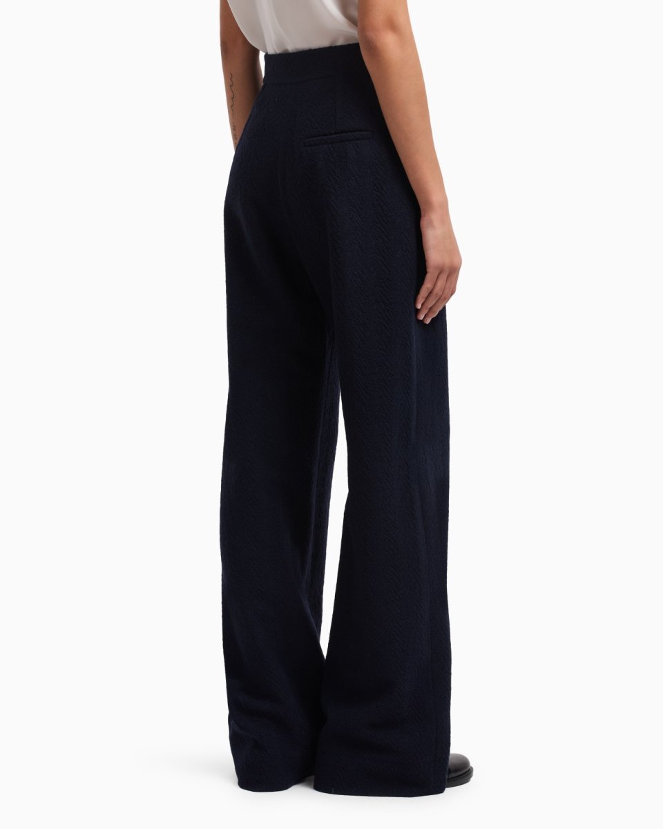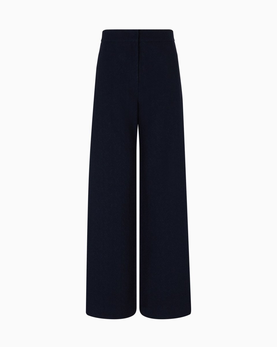 High-waisted trousers with a wide-leg, made of a virgin wool blend and embellished with the signature chevron motif, which has a sophisticated embossed look thanks to the expertly crafted jacquard that runs across the entire style, enhancing its exclusive allure. The garment is part of the Icon capsule collection.