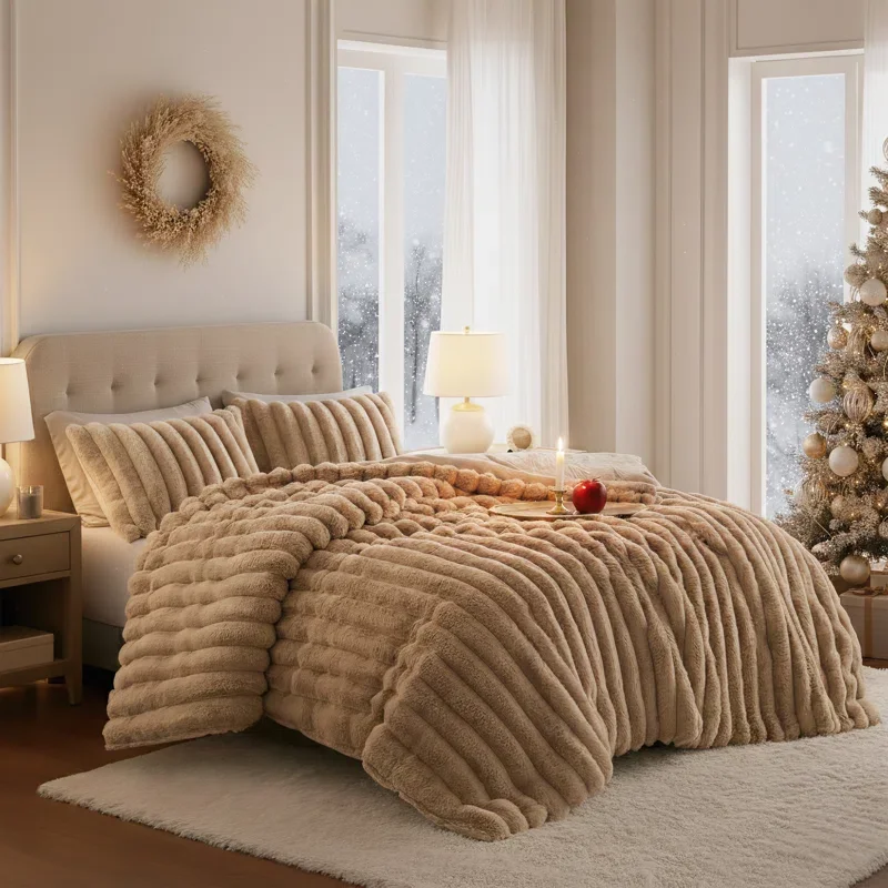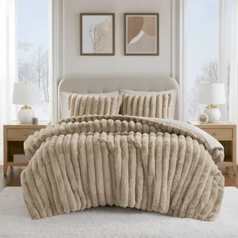 Curl up in the irresistibly cozy warmth of our luxurious, fluffy ribbed bedding set. Featuring a smooth faux fur front and an ultra-soft crystal velvet backing, this comforter’s cord-textured, raised striped design creates a snug and stylish haven you’ll never want to leave. Certified by Oeko-Tex, this set reflects our commitment to safety and gentle, non-irritating skin contact. Crafted with a high-quality polyester fill, this durable bedding set perfectly balances breathability and a premium hand feel, ensuring a truly refined sleep experience night after night. It is delivered uncompressed and ready to use straight out of the box for effortless convenience.